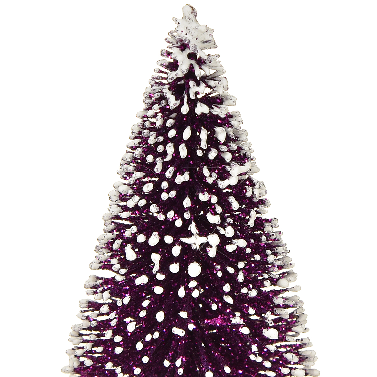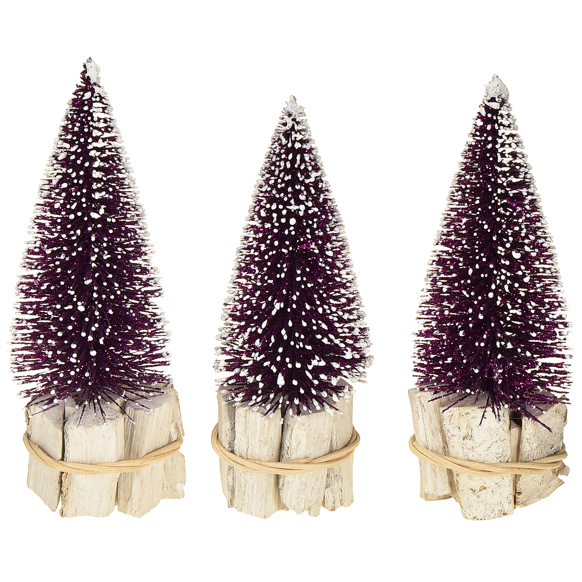 Názov produktu: Dekoratívny vianočný stromček vo fialovej farbe so snehovou špičkou na rustikálnom drevenom podstavci 15 cm, 3 kusy.