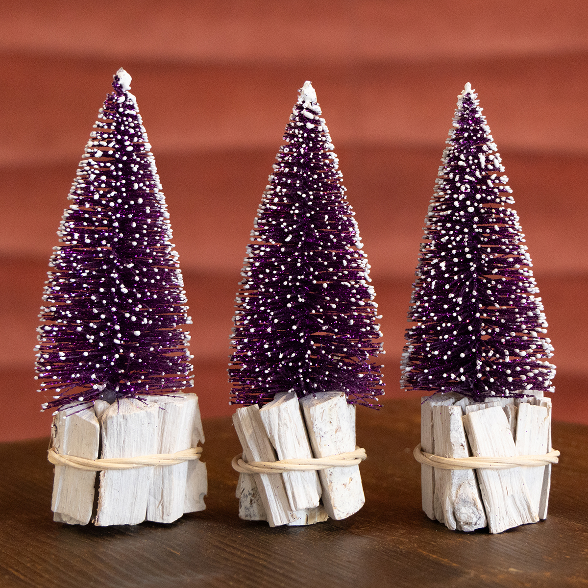 Dekoratívny vianočný stromček vo fialovej farbe so snehovou špičkou na rustikálnom drevenom podstavci 15 cm, 3 kusy.