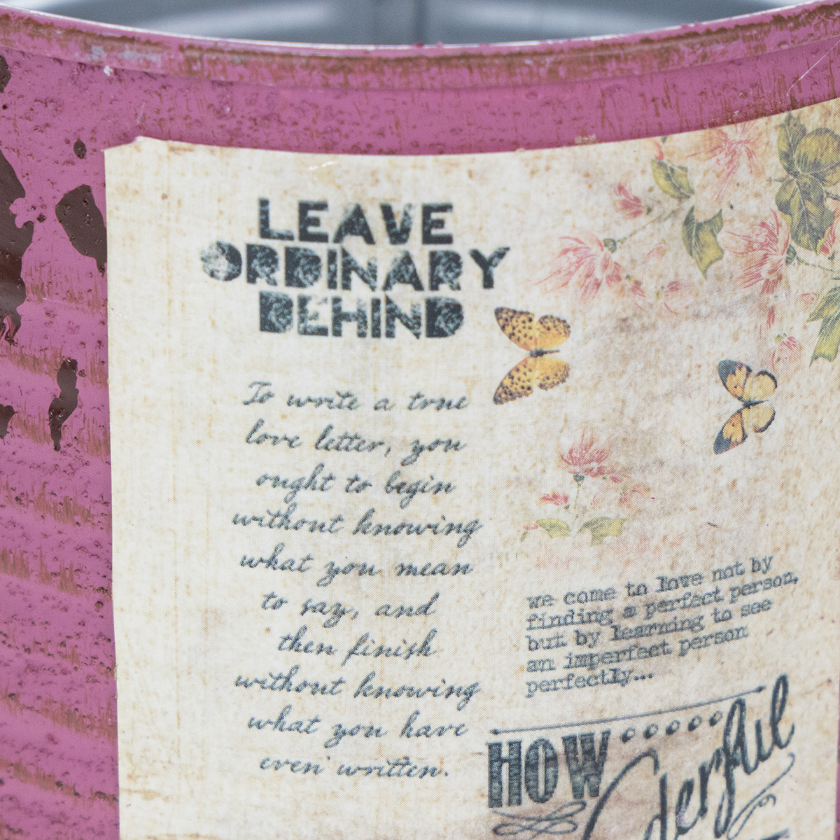 Tento vintage kvetináč sa šikovne prezentuje ako dekoratívna krabička vo fialovej farbe. Kovová letná dekorácia je krásne dvojfarebná: na drážkach plechovky vidno teplú hrdzavohnedú. Fialový pastelový tón je harmonicky zaoblený. Štítok s motýľmi a nápis v rôznych retro typoch písma, ako aj niektoré maľované hrdzavé škvrny na kvetináči vytvárajú nostalgickú atmosféru výsadby.