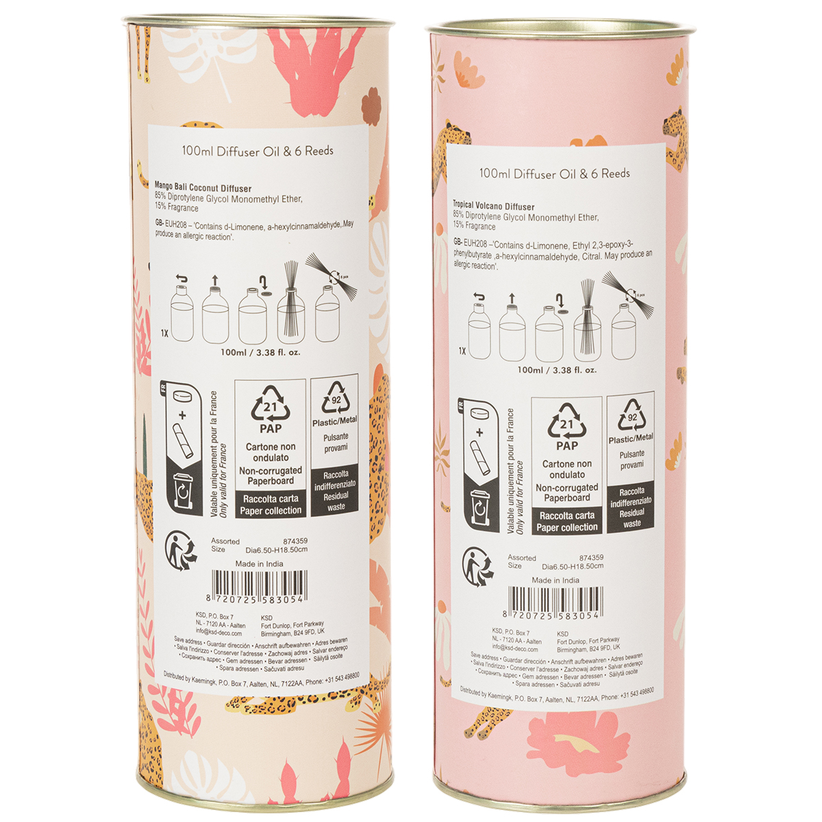 Tieto difuzéry do miestnosti uvoľňujú dve neodolateľné vône: mango a kokos. Kombinácia ovocnej sladkosti a krémových tropických tónov vytvára vo vašom obytnom priestore relaxačnú a príjemnú atmosféru. Sada dvoch difuzérov vám umožňuje prevoňať váš domov rôznymi spôsobmi, dokonale prispôsobenými vašim izbám alebo náladám. Či už sú umiestnené na príručnom stolíku v obývačke, použité ako dekoratívny prvok v kúpeľni alebo ako príjemná vôňa vo vstupnej hale, difuzér harmonicky zapadne do každého prostredia. Sklenené fľaštičky s priemerom šesť centimetrov a výškou 19 centimetrov sú nielen praktické, ale vďaka svojmu viacfarebnému dizajnu aj vizuálne príťažlivé.