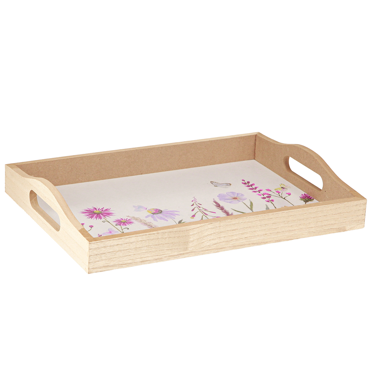 Tento mierne nostalgický obdĺžnikový drevený podnos je ideálny pre všetkých fanúšikov škandinávskeho a vidieckeho štýlu. Vďaka svojej prirodzenej farbe bez problémov zapadne do takmer každého prostredia. Biely základ podnosu zdobia jemné lúčne motívy, ako sú fialové a ružové kvety a motýle - skutočný vrchol jarnej a letnej dekorácie u vás doma. Obdĺžnikový drevený podnos možno vďaka praktickým úchytom použiť nielen ako štýlový dekoratívny prvok, ale je ideálny aj ako podnos na servírovanie. Umožňuje vám podávať raňajky do postele alebo pripravovať občerstvenie a nápoje počas príjemných večerov s priateľmi. Popustite uzdu svojej kreativite a vytvorte si vo svojom obývacom priestore atmosférickú atmosféru s týmto dekoratívnym prvkom pre váš príručný stolík.