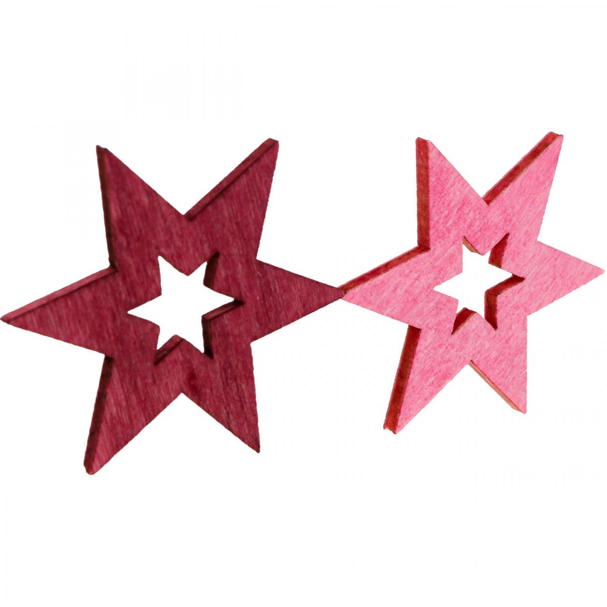 Jemné drevené disky vo fialovej a ružovej farbe majú z vnútornej a vonkajšej strany hviezdicový tvar. Drevené hviezdy sú malé a ľahké a dajú sa ľahko prilepiť na povrch alebo pomocou nite premeniť na prívesky.