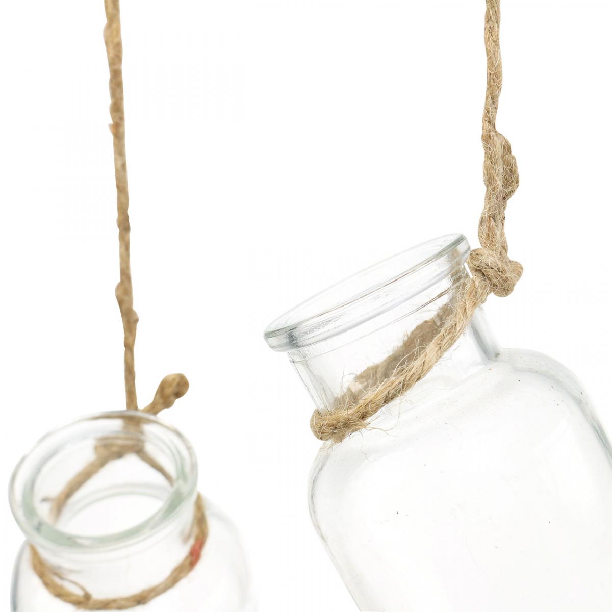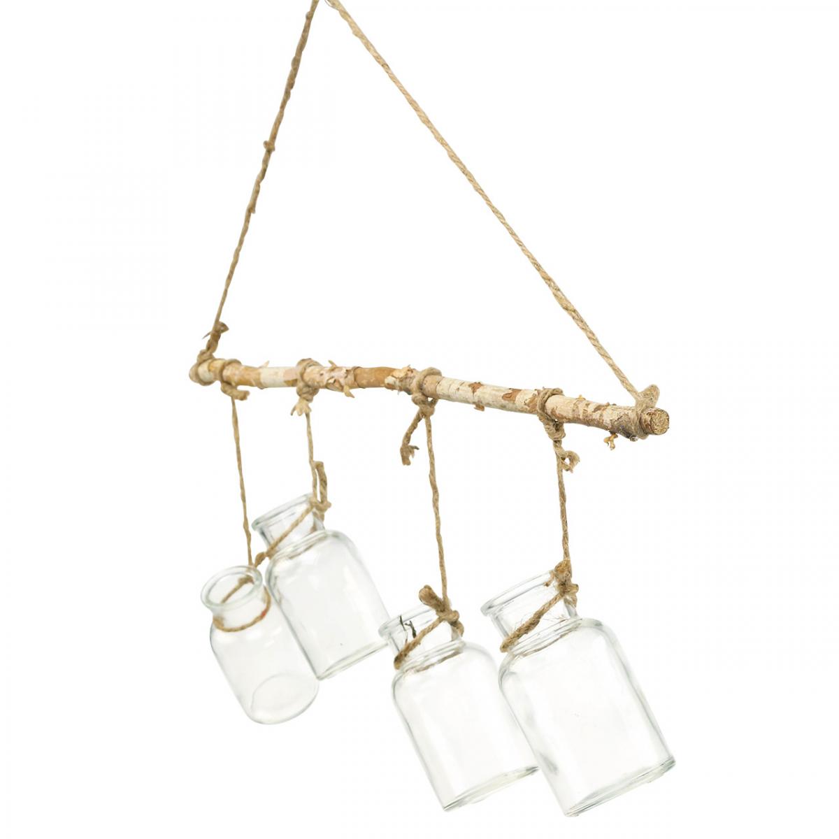 Štyri sklenené vázy sú pripevnené k prírodnej vetve v pravidelných rozostupoch jutovými šnúrami. Jutové lano s pútkom na vrchu ponúka praktický prostriedok na zavesenie okennej dekorácie.