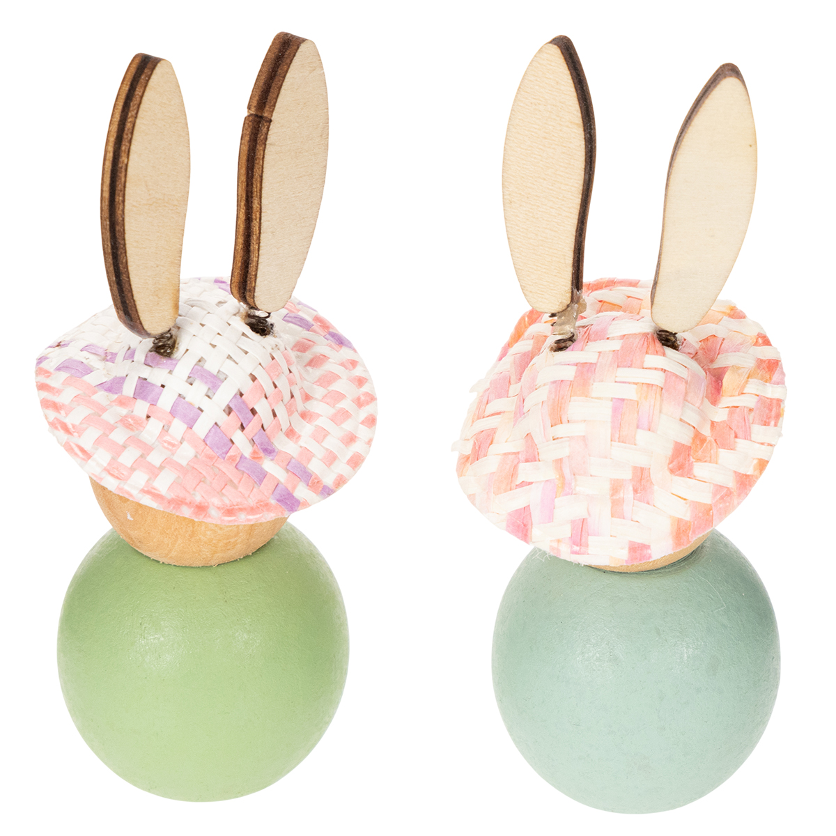 Tieto drevené figúrky zaujmú svojím prirodzeným šarmom a veselým vzhľadom: číre drevo v kombinácii s jemnými odtieňmi zelenej a mätovej sa stretáva s hravým dizajnom. Najmä ružové klobúčiky dodávajú figúrkam štýlový vintage nádych. Každý králik má výšku približne 9 cm a prináša do vášho domova nádych jari. Uši na kovových pružinách sú nielen vizuálne výrazné, ale dodávajú aj živý detail, ktorý určite upúta pozornosť.