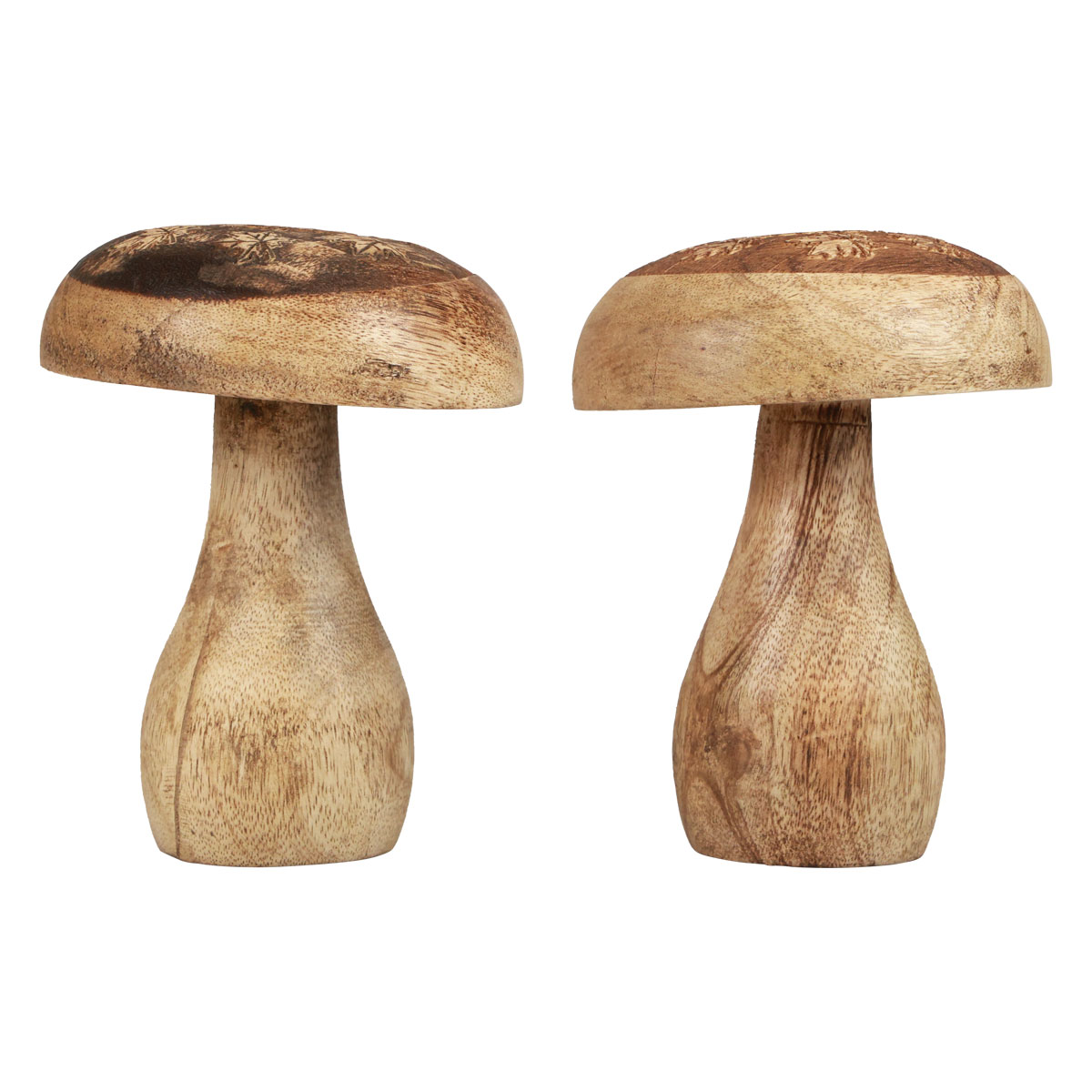 Vrch čiapky na tejto drevenej dekorácii je flambovaný a zdobený detailnými jesennými listami. Zrnitosť prírodného dreva sa na dekoratívnych hubách úžasne prejaví. Každý drevený hríb je trochu iný, takže pestrosť a autenticita je vo vašej výzdobe zaručená.
