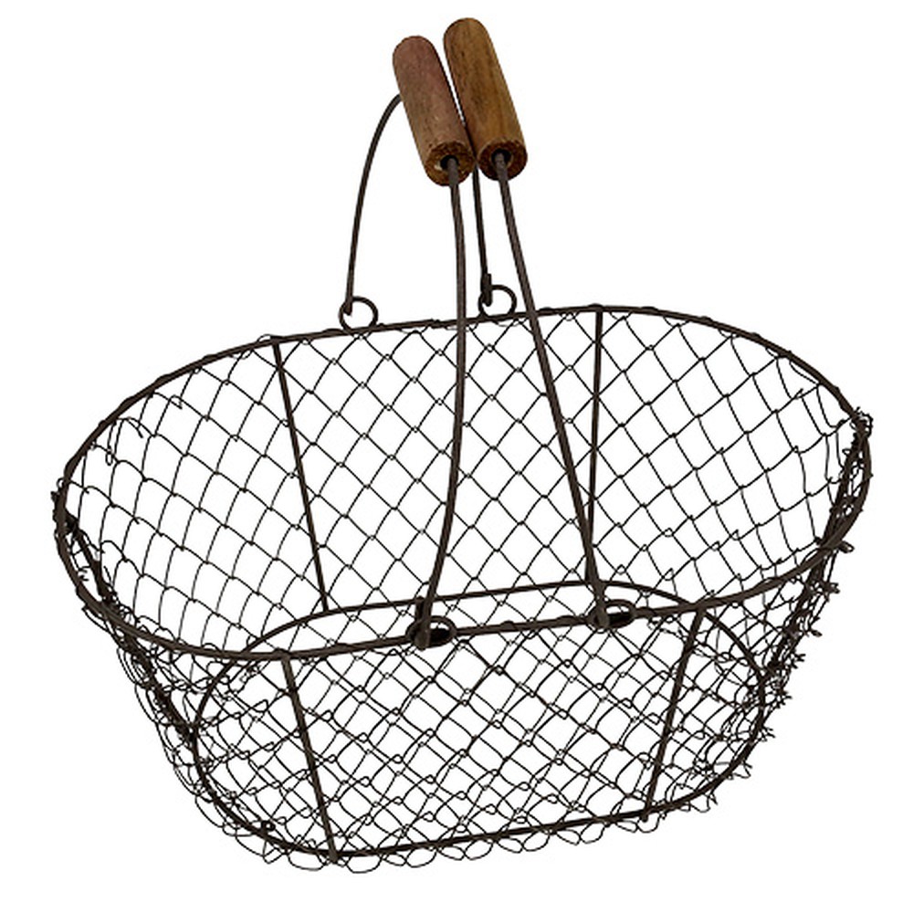 Oválny drôtený košík s rúčkou meria približne 27 x 16,5 cm a je vysoký cca 13,5 cm. Kovové vzpery sú potiahnuté špeciálnym hnedým náterom, ktorý napodobňuje hrdzavý povrch a spolu s brúsenými rukoväťami je úplne inšpirovaný vintage.