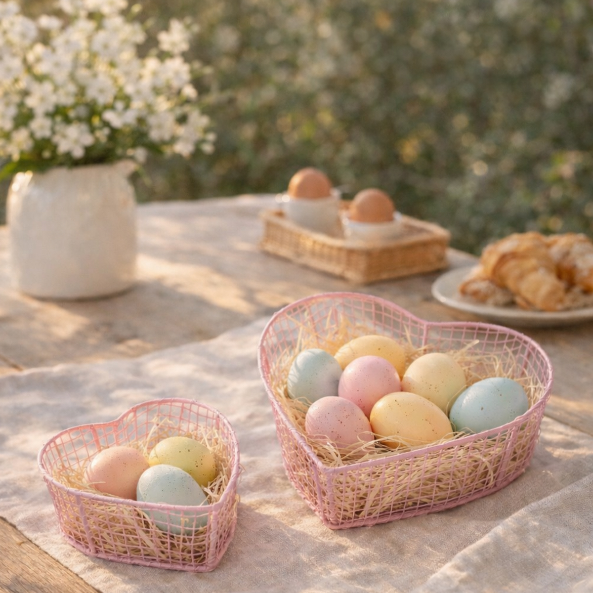 Vytvorte romantickú a zároveň usporiadanú atmosféru s týmito krásnymi drôtenými košíkmi v tvare srdca. Či už ich použijete ako dekoratívny doplnok na stole, na uloženie drobností alebo ako štýlovú darčekovú sadu, tieto kovové košíky v tvare srdca prinesú do vášho domova lásku a poriadok. Košíky sú vyrobené z pevného kovu a sú v jemných ružových a fialových tónoch. Sú ideálne na použitie v obývacích priestoroch alebo krytých vonkajších priestoroch a sú ideálnou voľbou pre romantickú výzdobu stola pri špeciálnych príležitostiach, ako sú svadby, Valentín alebo narodeniny.