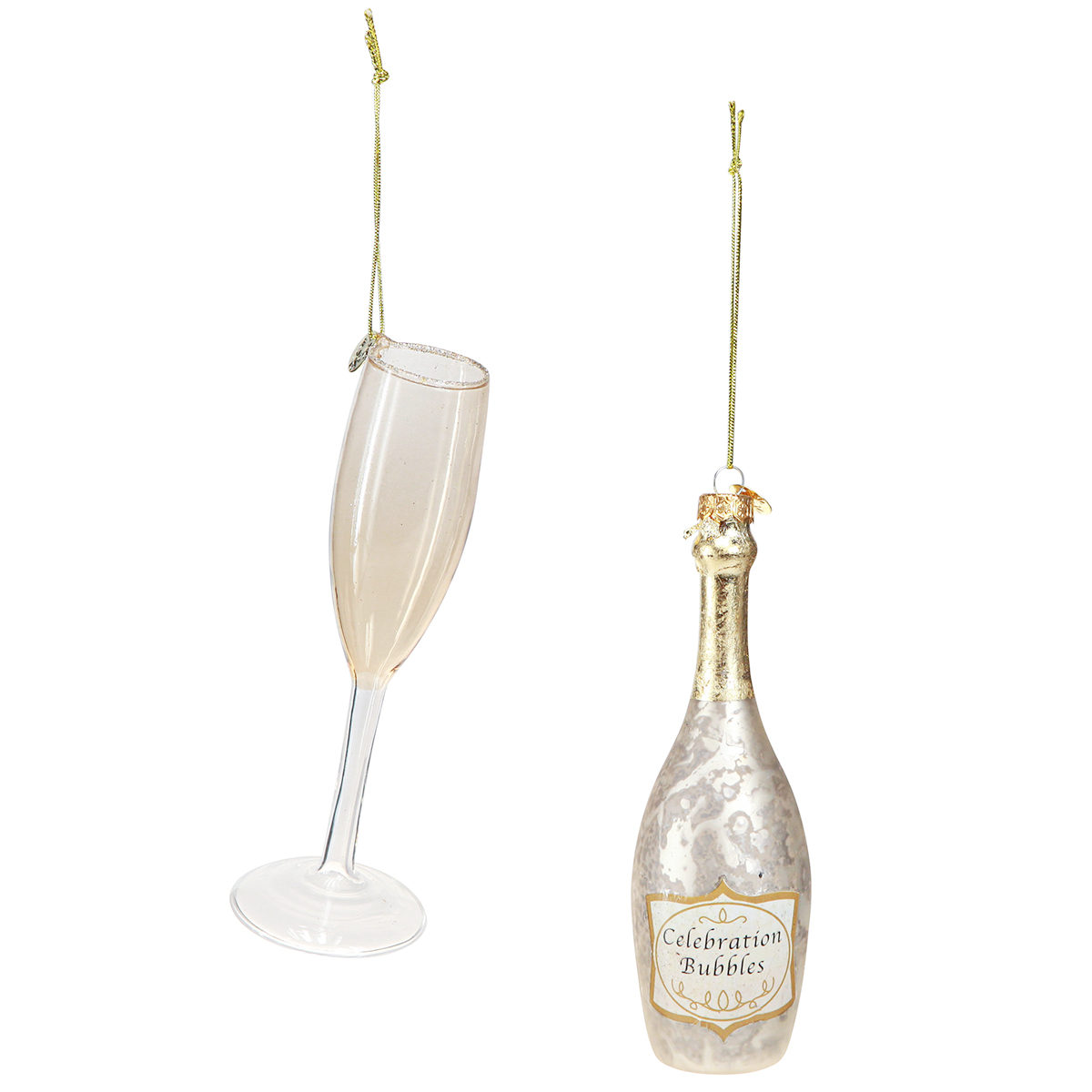 Fľaša na šampanské a pohár, ozdoba na stromček, výročie, sklenená ozdoba na zavesenie, Silvester H14,5cm skutočné sklo sada 2ks