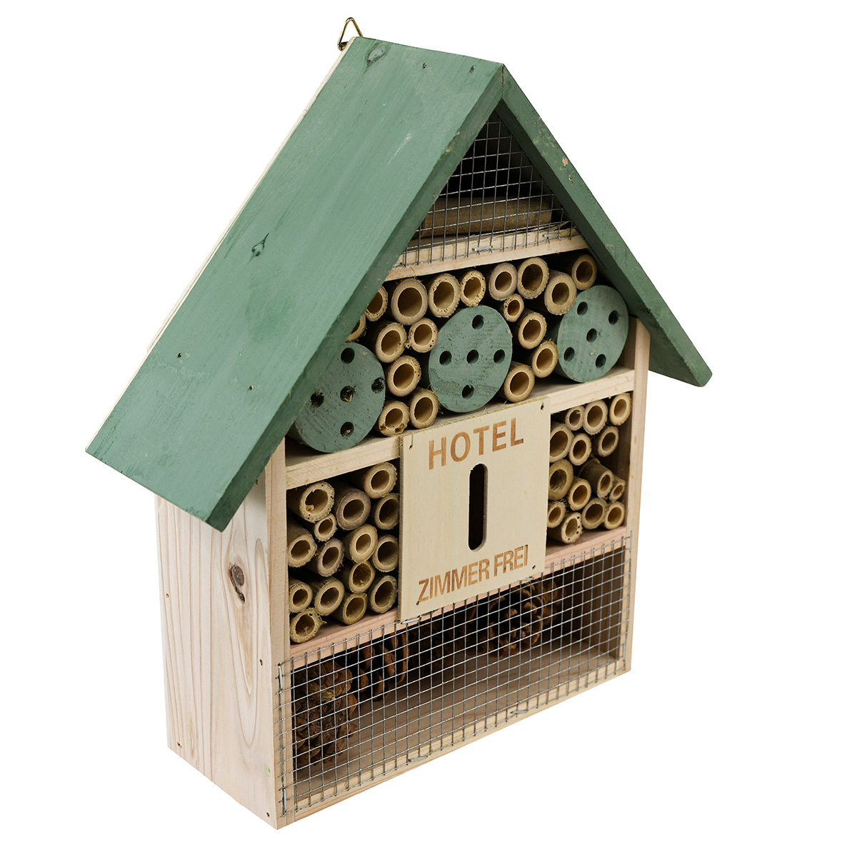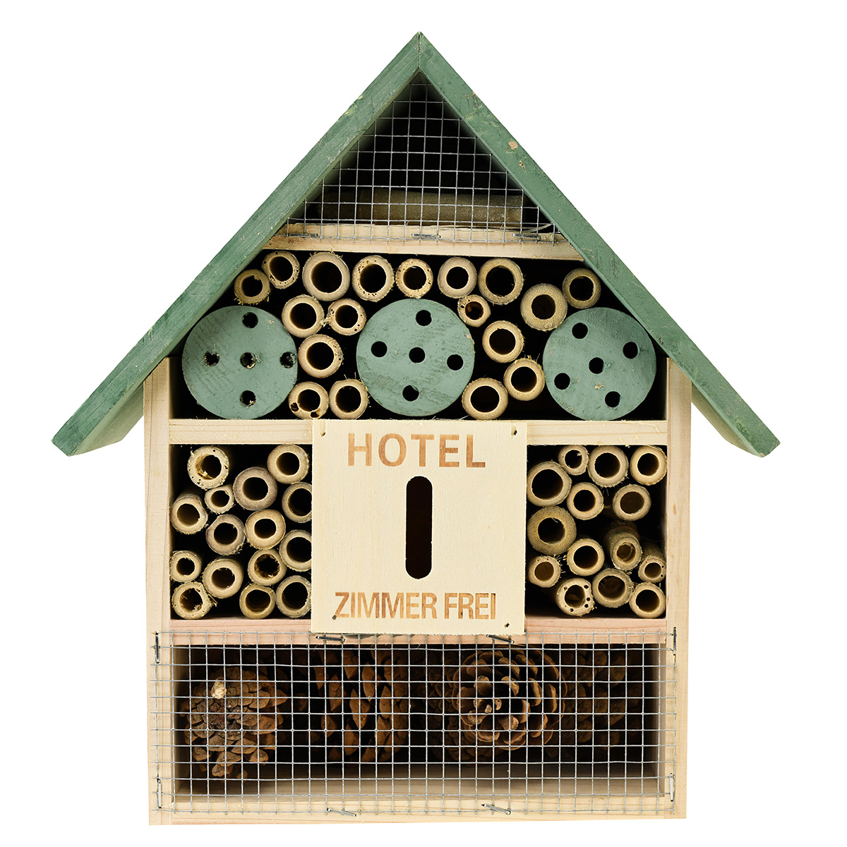 V hmyzom domčeku je vždy „voľná miestnosť“. Prízemie a podkrovie boli pokryté drôtom. To znamená, že uvoľnené čapy a kusy dreva nemôžu vypadnúť. Vďaka malému oku ponúkajú priehradky aj ochranu malých chrobákov pred väčšími predátormi, keď si pochutnávajú na drevených alebo šiškových šupinách.