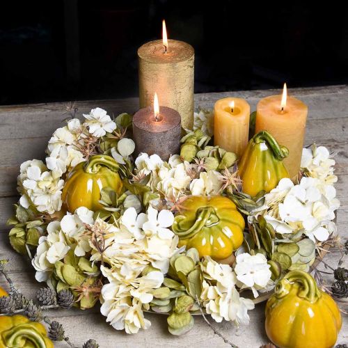Jesennú záhradnú hortenziu môžeme prezentovať ako solitér v menšej váze alebo ako jesennú kyticu. Veľká hlavička je vhodná aj ako stred jesennej kytice z hodvábnych kvetov a umelej trávy. Skombinujte záhradný kvet s jesennými allium alebo ružovými umelými hortenziami. Jesenné dekorácie sú vďaka týmto veľkým umelým kvetom vždy opulentné.