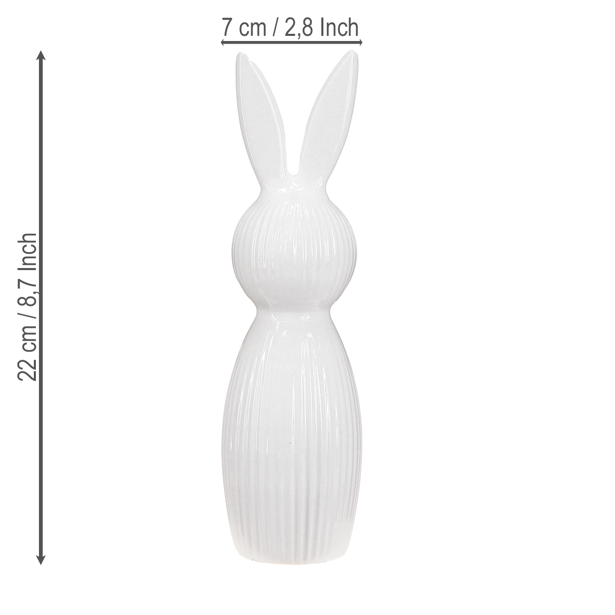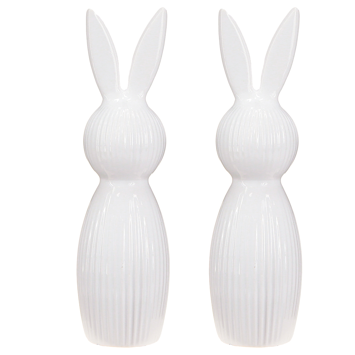 Táto jednoduchá figúrka králika, vyrobená z vysoko kvalitnej keramiky, sa vyznačuje jedinečnou kombináciou minimalistického dizajnu a funkčnosti. Vysoko lesklý povrch dodáva figúrkam špeciálnu hĺbku a reflexnú kvalitu, vďaka čomu sa okamžite stanú ústredným bodom vašej dekorácie. Sú ideálne na jarné a veľkonočné dekorácie, či už na veľkonočný stôl, v modernej veľkonočnej kytici alebo ako decentný pútač pozornosti na vašom recepčnom stole. Ich výška 22 cm dosahuje ideálnu rovnováhu medzi prítomnosťou a decentnou eleganciou. Jemne rebrovaný povrch robí z figúrky králika potešenie pre oko aj dotyk. Tí, ktorí cenia decentnú eleganciu, si zamilujú neutrálnu bielu farbu. Krásne ladí s takmer akýmkoľvek štýlom: moderné sklenené svietniky, minimalistické vázy alebo iné svetlé jarné doplnky. Či sa rozhodnete vystaviť tieto dekoratívne králiky jednotlivo alebo v páre, je úplne na vašej kreativite! Malý tip: Doplňte figúrky ďalšími bielymi keramickými dekoratívnymi prvkami alebo ich skombinujte s pastelovými akcentmi – vytvoríte tak harmonické akcenty pre úplne vydarenú jarnú dekoráciu.