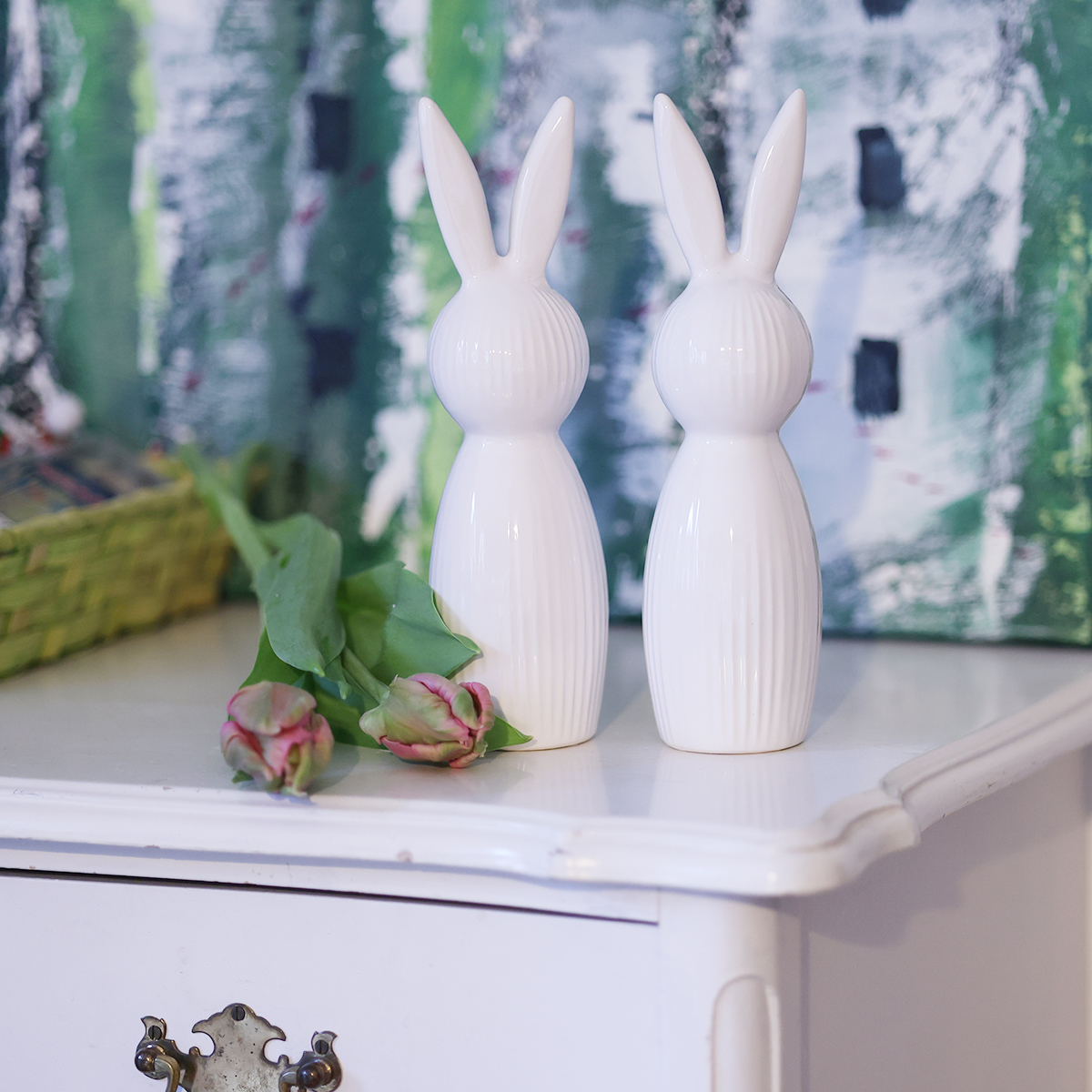 Jar v obývačke, na príborníku alebo v ráme okna – s touto pôvabnou figúrkou králika žiadny problém. Táto jednoducho navrhnutá, 22 cm vysoká figúrka sa dodáva v sade dvoch kusov a ponúka dokonalú zmes modernej elegancie a decentnej estetiky. Vďaka lesklému bielemu povrchu a jemnej ryhovanej textúre vyzerá sofistikovane, no zároveň nenápadne. Hľadáte jarnú dekoráciu, ktorá sa dokonale hodí do moderných štýlov interiéru, ako je škandinávsky minimalizmus alebo súčasný dizajn? Potom sa bližšie pozrite na túto keramickú figúrku králika. Dokonale doplní váš štýl, najmä v kombinácii so sviežimi zeleno-bielymi kyticami alebo s jarnými aranžmánmi dekoratívnych vajíčok. Znie to lákavo? Objednajte si teraz a urobte zo svojho domova skutočný pútač pozornosti túto sezónu!