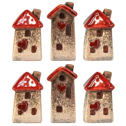 Keramický domček s červeným strešným oknom a srdcom - 6 cm - Idylická dekorácia pre dom a záhradu - 6 ks