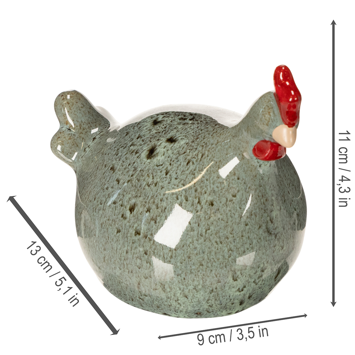 Tieto dve dekoratívne kuriatka vo veselom zelenom odtieni zaujmú harmonickou kombináciou jednoduchých tvarov a rustikálneho šarmu. Každá figúrka je starostlivo vyrobená z vysoko kvalitnej keramiky a má hladký povrch, ktorý krásne zvýrazňuje jej jemné sfarbenie. S praktickými rozmermi 13 x 9 x 11 centimetrov sa kuriatka dokonale hodia do akéhokoľvek interiéru. Červené detaily na ich hrebeňoch a zobákoch dodávajú očarujúci a žiarivý nádych, ktorý rozžiari každé prostredie.