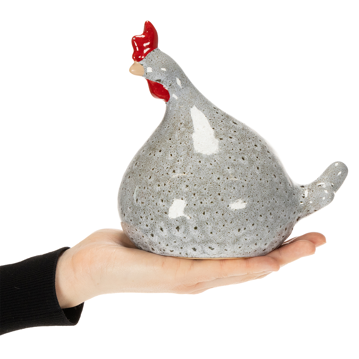 Tieto keramické figúrky kurčiat s rozmermi 16 cm na výšku a 13 cm na šírku sú dokonale proporcionálne prispôsobené elegantným stolom, policiam alebo príborníkom. Ich očarujúci tvar v kombinácii s modro škvrnitou povrchovou úpravou dodáva kuriatkam hravú eleganciu. Tí, ktorí majú zmysel pre detail, ocenia výrazný zobák a drobné oči – úspešnú zmes modernity a nádychu rustikálneho šarmu.