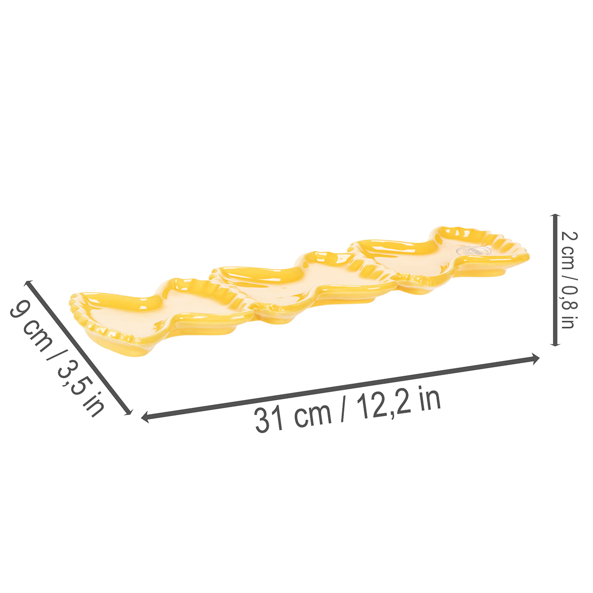 Táto keramická miska na namáčanie s dĺžkou 31 cm a šírkou 9 cm ponúka dostatok miesta na vaše obľúbené malé sústa. Hravý tvar misky s cestovinami jej dodáva očarujúci charakter a robí z nej skutočný pútač pozornosti na každom stole. V kombinácii s ďalšími žltými doplnkami, ako sú napríklad vázy na cestoviny z našej kolekcie, sa váš stôl stane harmonickým umeleckým dielom, ktoré sa dokonale hodí k stredomorskému alebo letnému štýlu.