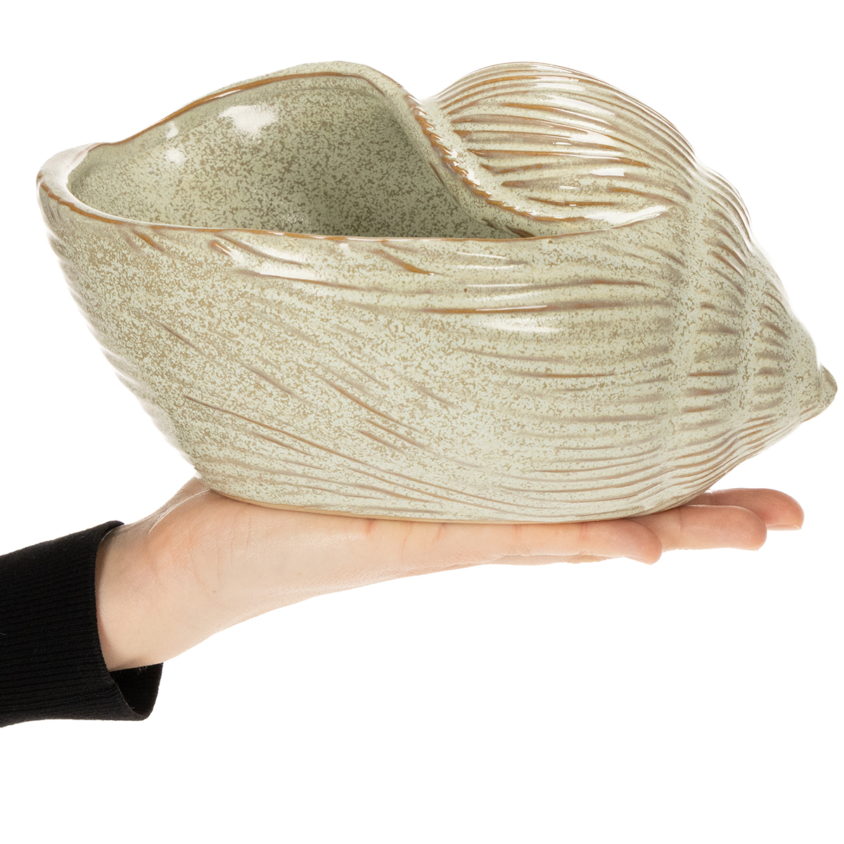 Jedinečný tvar tejto keramickej misy pripomína jemné krivky mušle. Jemná súhra splývavých zelených a jemných béžovo-hnedých akcentov jej dodáva nadčasovú krásu. Pohľad na tento dizajn evokuje spomienky na dlhé prechádzky po pláži – do každej miestnosti prináša pokojnú atmosféru inšpirovanú prírodou. Misa je ideálna na atraktívne odloženie kľúčov vo vstupnej hale, vystavenie malých šperkov na toaletnom stolíku alebo dokonca ako kvetináč, ktorý dodá nádych elegancie s malými sukulentmi.