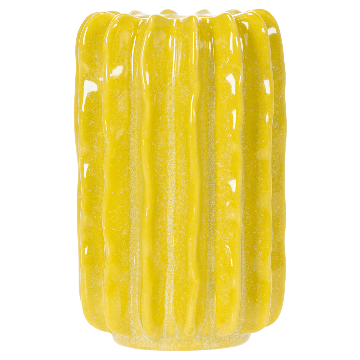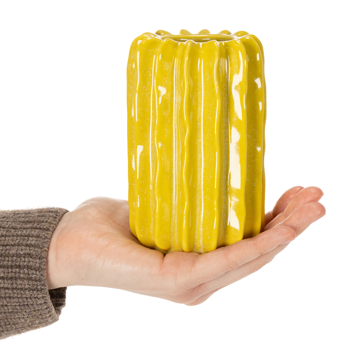 Táto žltá keramická váza s drážkami šikovne kombinuje formu a funkciu. S výškou 13 cm a priemerom 8 cm je ideálnou voľbou pre malé izbové rastliny, ako sú sukulenty, alebo pre kvetinové aranžmány so sušenými kvetmi. Exotický štýl tohto dizajnu evokuje letné púštne sny a robí z nej ozdobu každého stola.