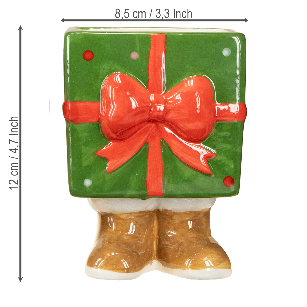 Originálne vianočné dekorácie s niečím určitým – v tomto prípade s nožičkami: Nechajte sa očariť týmto keramickým vianočným kvetináčom! Tieto pôvabné darčekové balíčky s nožičkami a veľkou červenou mašľou jednoducho patria na každý adventný stôl – alebo na parapet. Či už v obývačke, na stole alebo ako originálny pútač pozornosti v kancelárii: tieto malé umelecké diela vykúzlia počas vianočného obdobia v každom prostredí hrejivú slávnostnú atmosféru.