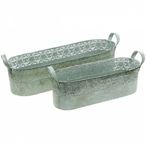 Nádoba je vyrobená z pozinkovaného kovu: S umelými známkami opotrebovania a nostalgickým retro vzorom v bordúre vyzerá jardiniéra nádherne starožitne. Kvetinový žľab má navyše držadlá - praktické na rýchle vyzdobenie, vytiahnutie kvetináčov z páliaceho slnka alebo prečistenie stola!