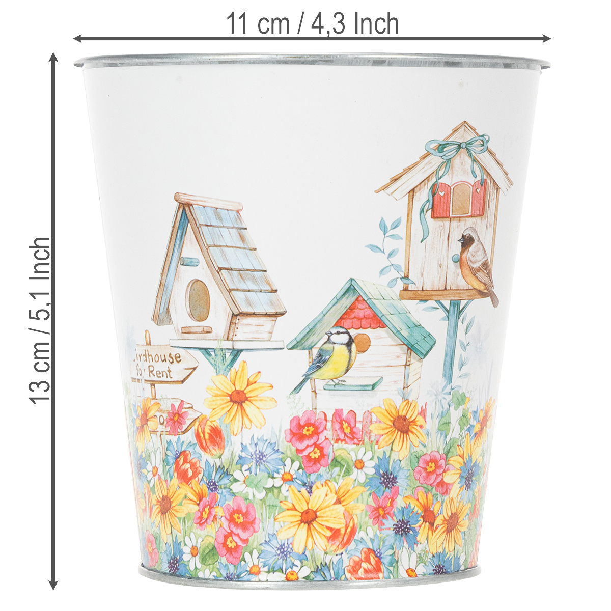 Toto plechové vedierko je potiahnuté fóliou s potlačou, na ktorej môžete vidieť farebné more kvetov, v ktorých sú tri rôzne hniezdne búdky - možno vidieť aj niekoľko vtákov.