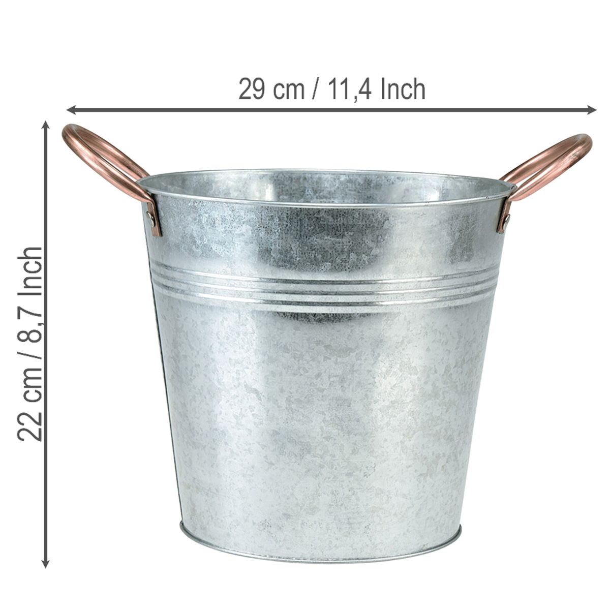 Podmanivý kontrast rôznych kovov vytvárajú medené rúčky tohto kovového vedra. Pozinkovaný, lesklý strieborný povrch dodáva kvetináču jemný vintage vzhľad. Pred výsadbou je vhodné kovovú nádobu vystlať fóliou, aby sa zabránilo hrdzi a korózii.