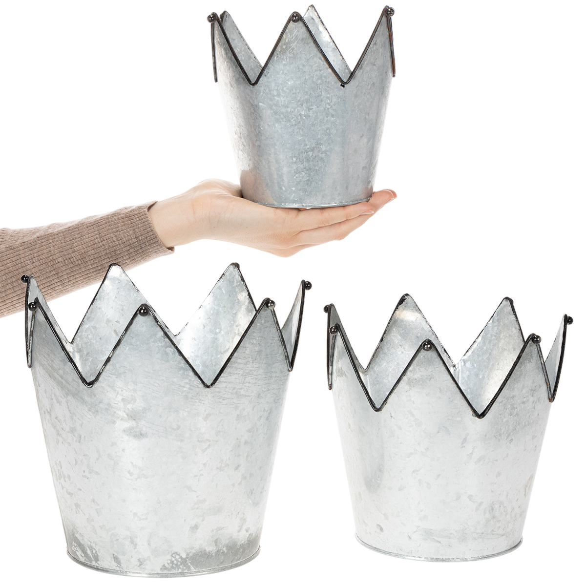 Kovový ozdobný kvetináč, zinok, koruna, Ø21,5/19,5/17 cm, sada 3 kusov