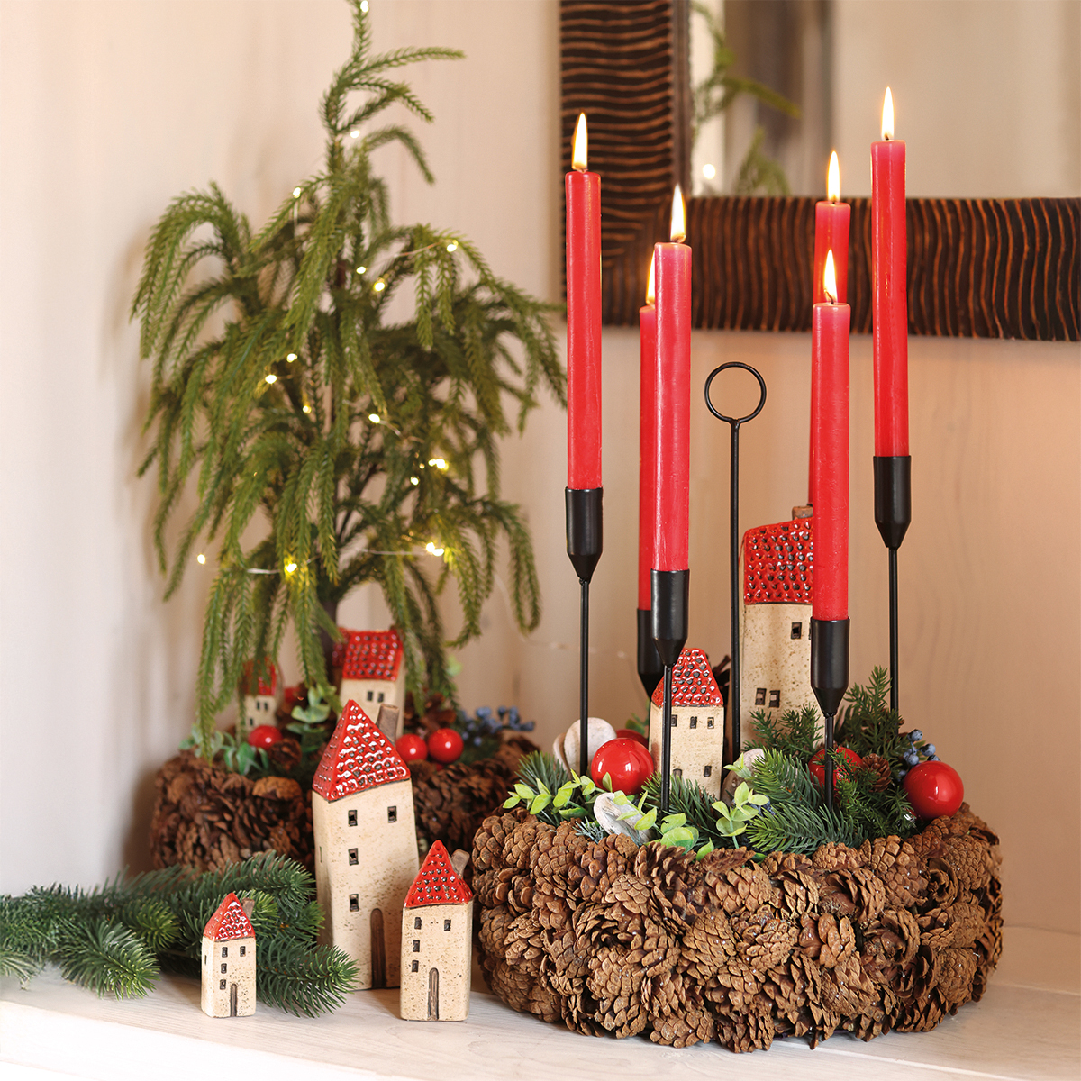 - Vytvorte si slávnostnú adventnú výzdobu kombináciou svietnika s jedľovými vetvičkami a malými dekoratívnymi figúrkami z radu Floristik24.