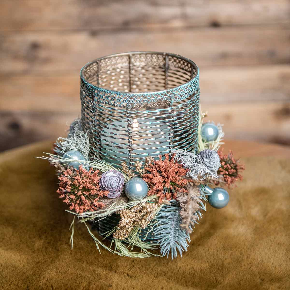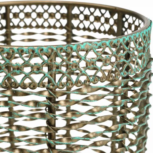 Kovové pásy sú do seba zatočené a umne navrhnuté tak, aby tvorili valcový tvar svietnika. Horný kovový okraj tvoria obzvlášť zdobené ornamenty. Základná farba svietnika je noblesná zlatohnedá, ktorá je pokrytá svetlými tyrkysovými ťahmi štetca a vytvára tak umelú medenú patinu.