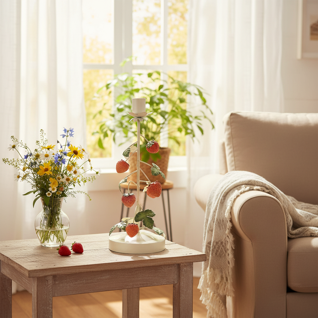 Exkluzívny kovový svietnik s jahodovým zdobením – ideálny pre vašu letnú dekoráciu
