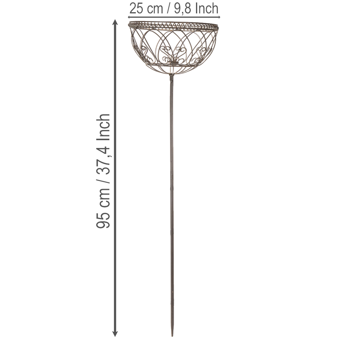 Dodajte svojej záhrade, terase alebo balkónu nádych romantiky s týmto dekoratívnym kovovým košom vo vintage štýle. Tento kvalitný záhradný kôš je vyrobený z pevného, hnedo natretého kovu a je ideálny do chránených vonkajších priestorov. S výškou 95 centimetrov a priemerom 25 centimetrov vyžaruje eleganciu a určite upúta pozornosť. Či už ho použijete ako dekoratívnu misu v záhrade, štýlovú mriežku vo vintage štýle alebo držiak na kvetináč na terasu, tento kovový kôš vytvorí očarujúcu atmosféru a zaujme svojou všestrannosťou.