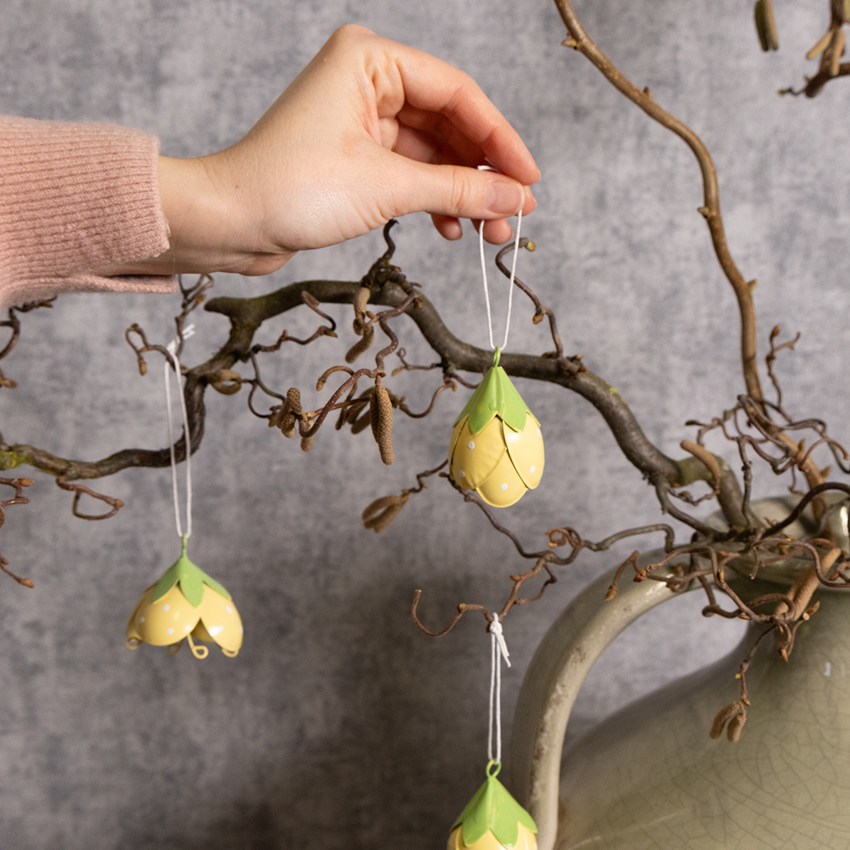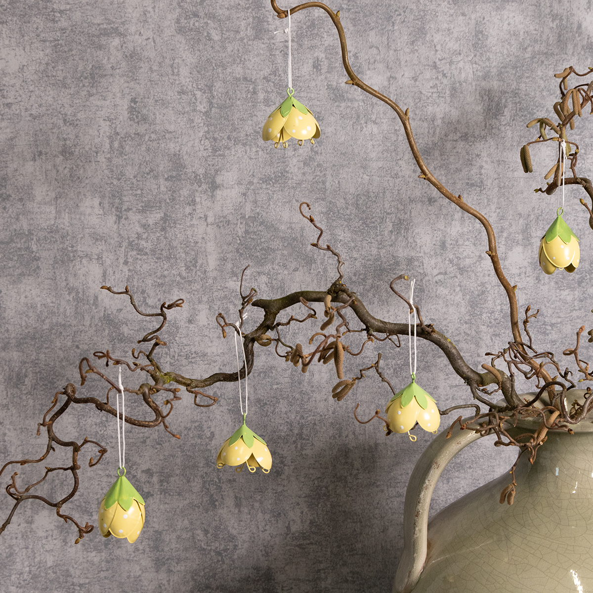 Tieto závesné kovové kvety sú ideálne pre každého, kto miluje hravé a romantické dekorácie. S výškou 6 cm a priemerom 4 cm nie sú príliš veľké, no napriek tomu sú štýlovým pútačom pozornosti. Jemné žlté a zelené farby vytvárajú svieži vzhľad a krásne sa integrujú do rôznych štýlov – od vidieckeho štýlu a shabby chic až po klasické kvetinové aranžmány. Vďaka svojej vysoko kvalitnej kovovej konštrukcii sú kvety robustné a vhodné na použitie v interiéri aj exteriéri. Obzvlášť pôvabne vyzerajú vo vstupnej hale, kde vítajú hostí veselým nádychom.