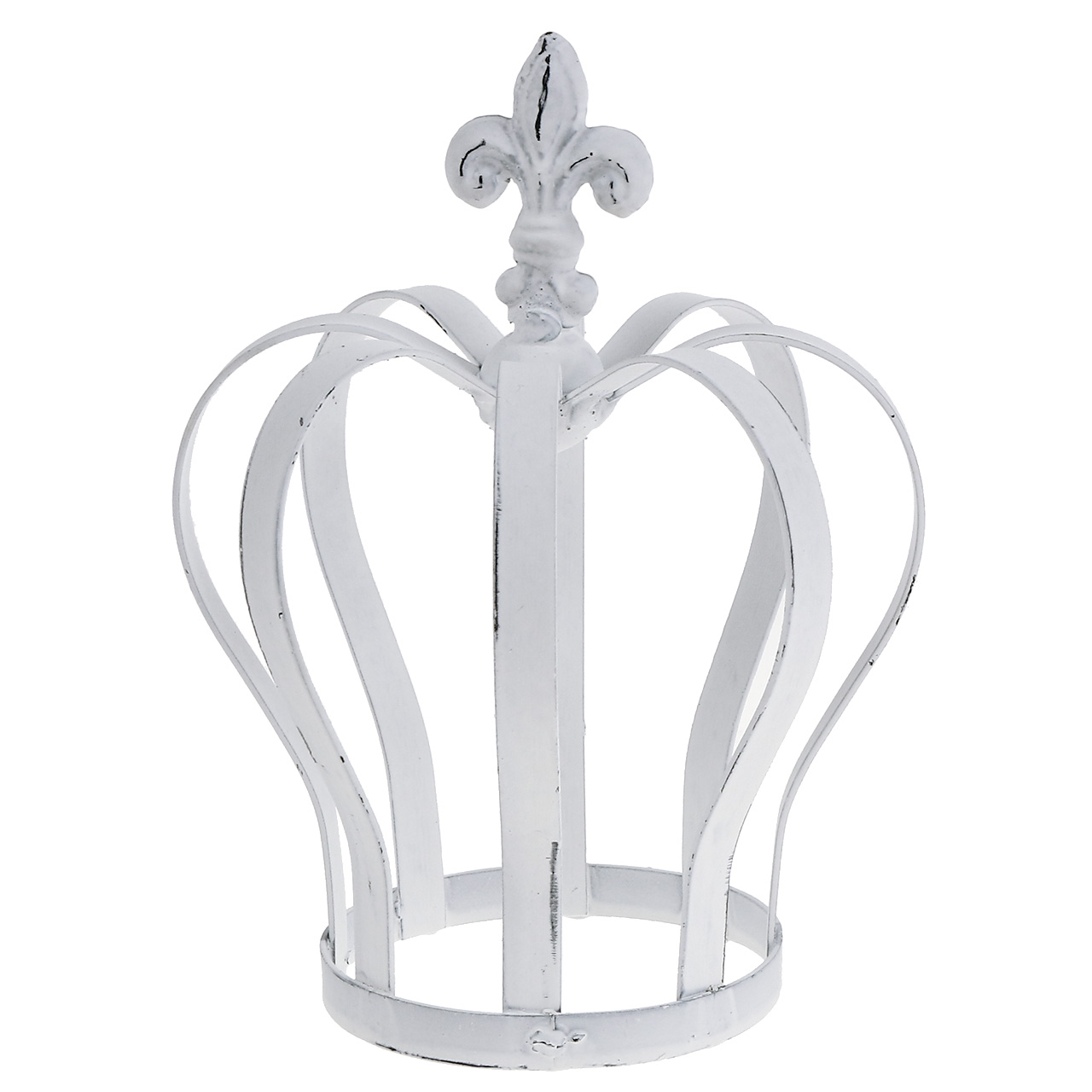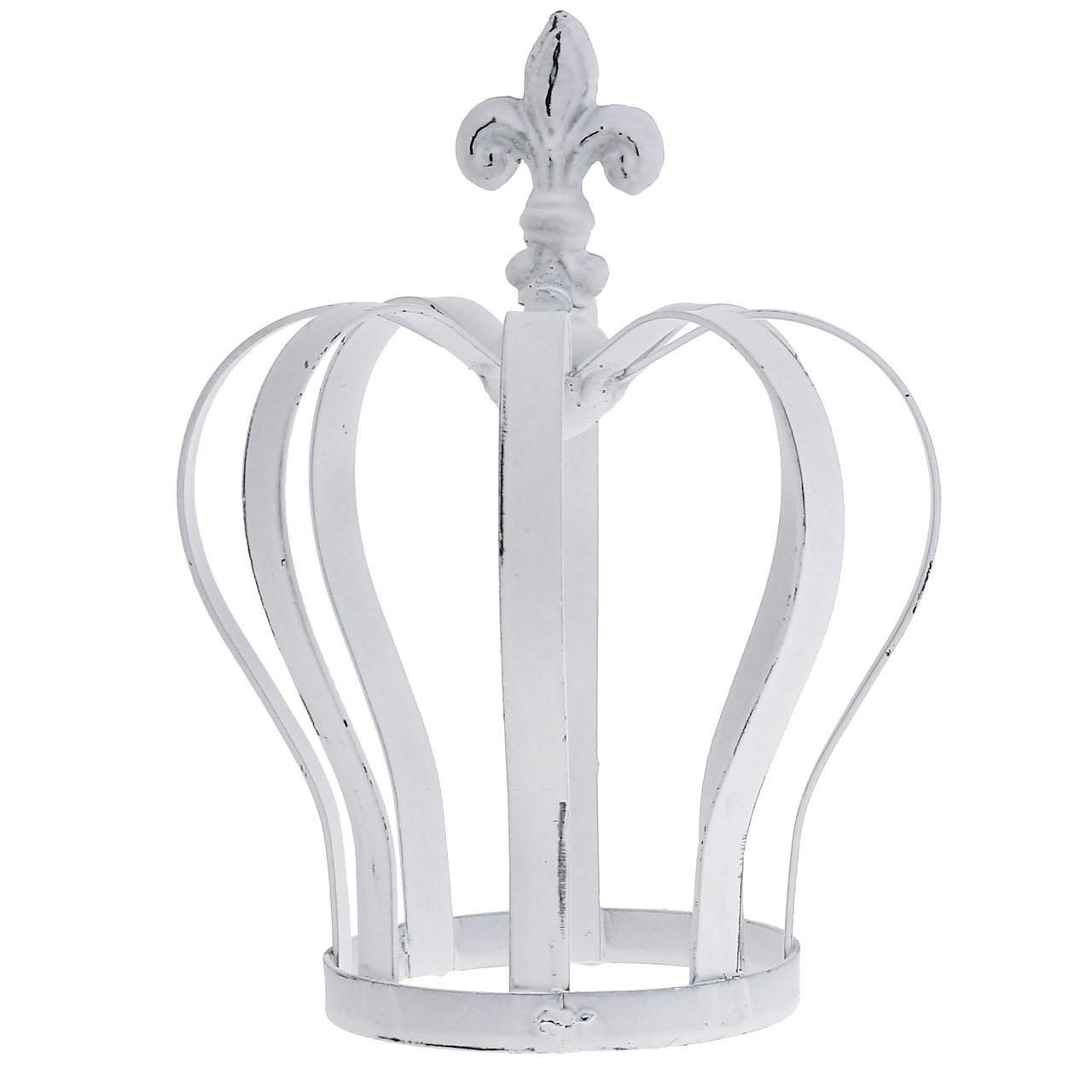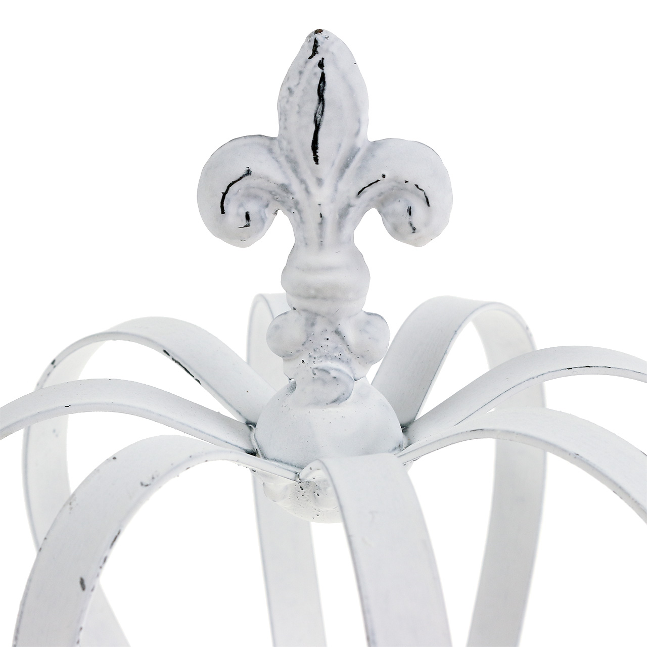 Absolútny vrchol pre každý interiér a tiež pre vonkajšiu dekoráciu: kovová korunka v starožitnej bielej farbe! Korunka je vyrobená z odolného kovu a má biely matný povrch, ktorý je len čiastočne nepriehľadný, čo korunke dodáva vintage vzhľad a hodí sa k ošúchanému elegantnému dekoru. Zakrivené kovové vzpery končia v hornej časti ornamentom.