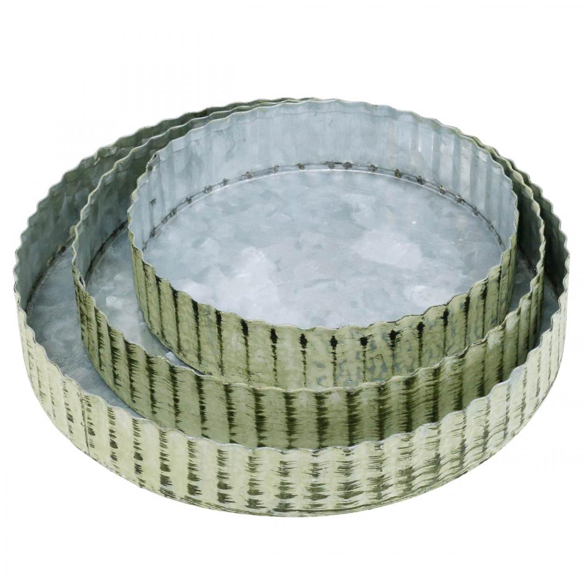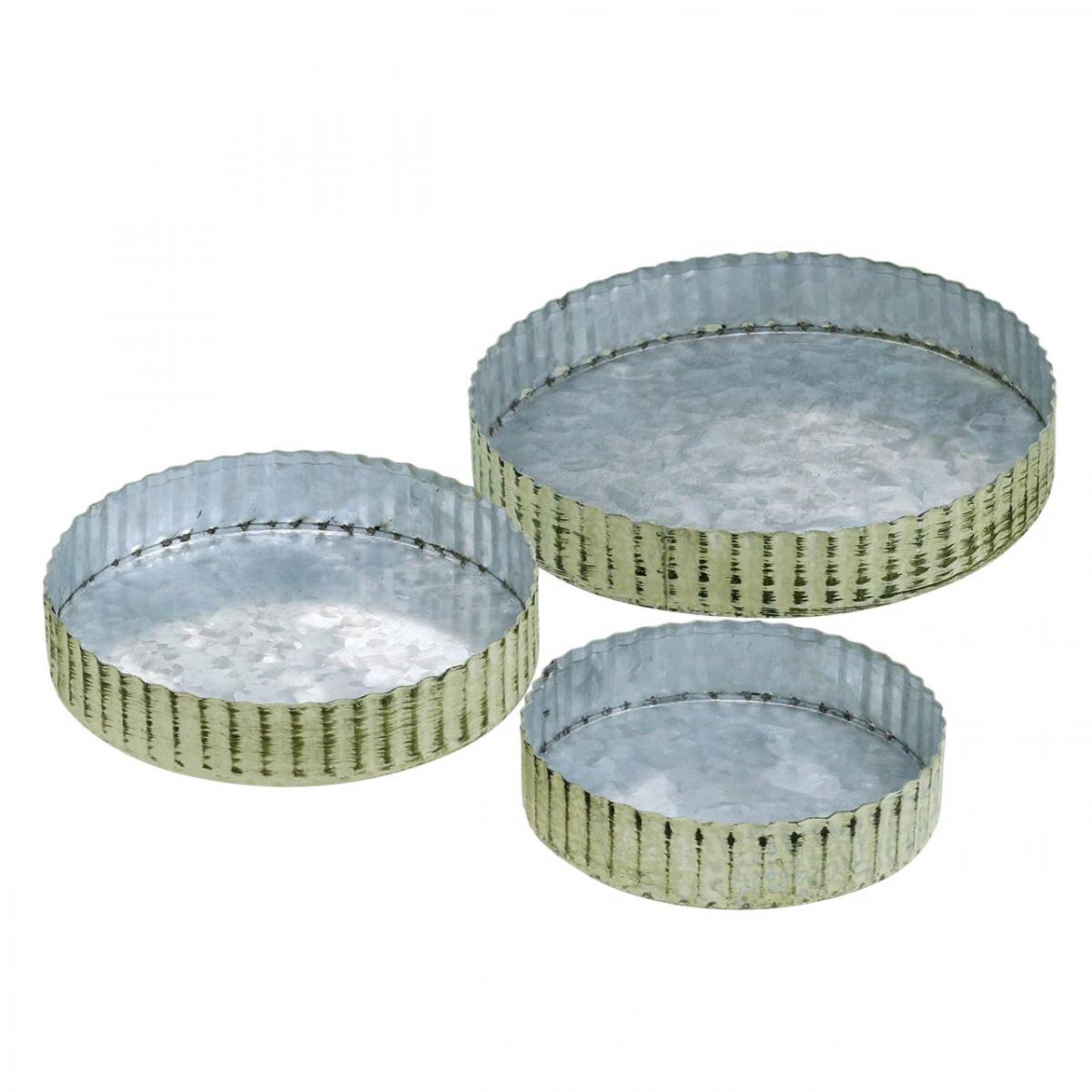 Kovové taniere na zdobenie, dekorácia na stôl, podnos na sviečky okrúhly strieborný, zelený shabby chic Ø14/16,5/19,5 cm V3,5 cm sada 3 ks