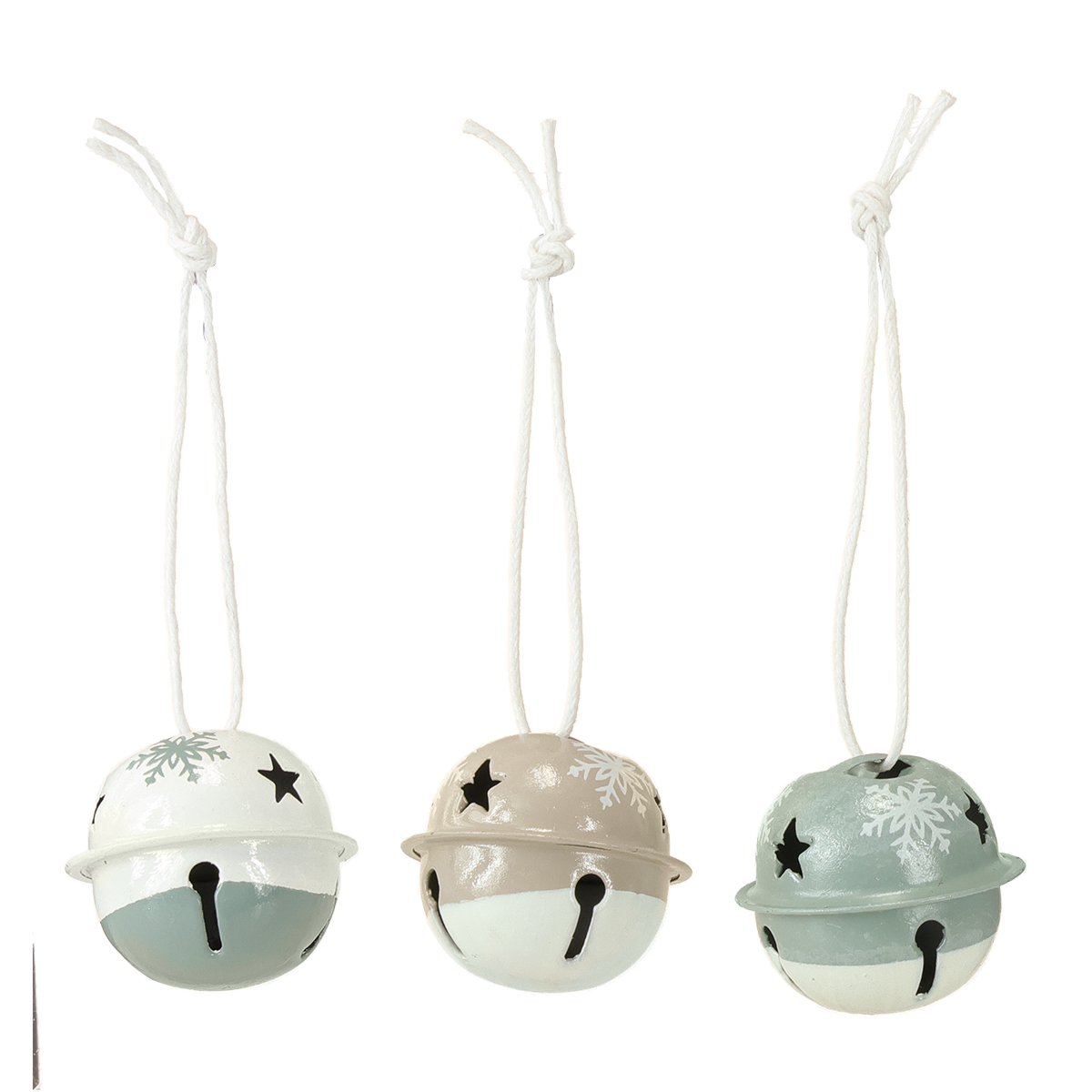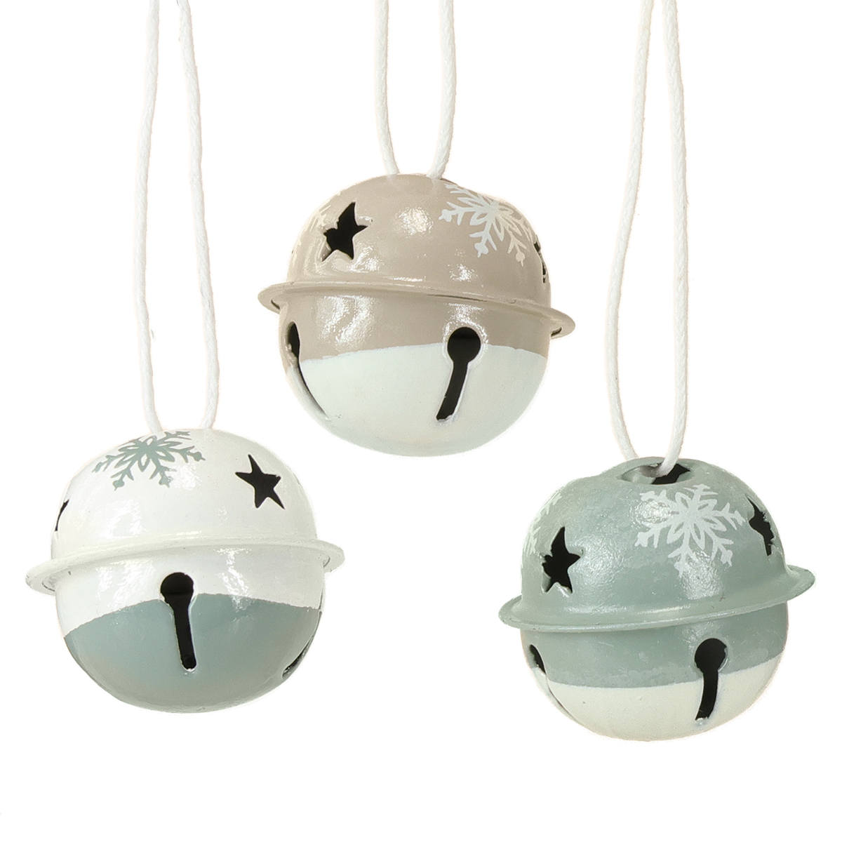 Tieto malé zvončeky sú navrhnuté v moderných vianočných farbách: Krásne kovové zvončeky sú navrhnuté v dvoch farbách na bielom pozadí v ľadovo mätovej a béžovej farbe.