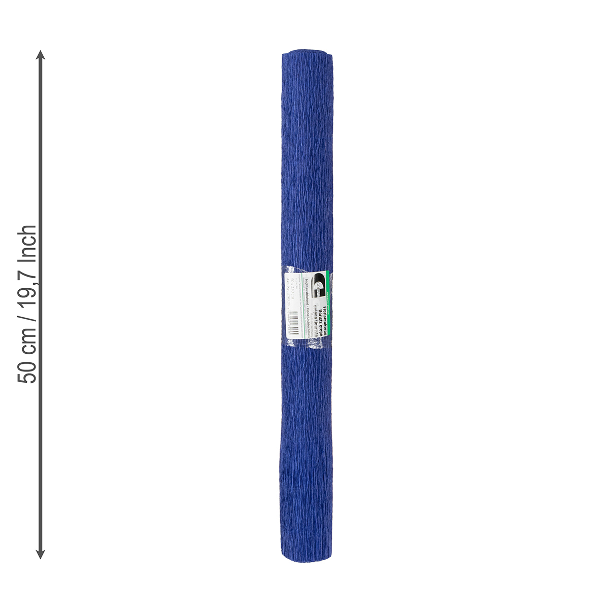 Kvetinársky krepový papier v tmavomodrej farbe je navinutý do rolky s hmotnosťou okolo 160 gramov. Po rozvinutí meria približne 50 x 250 centimetrov.