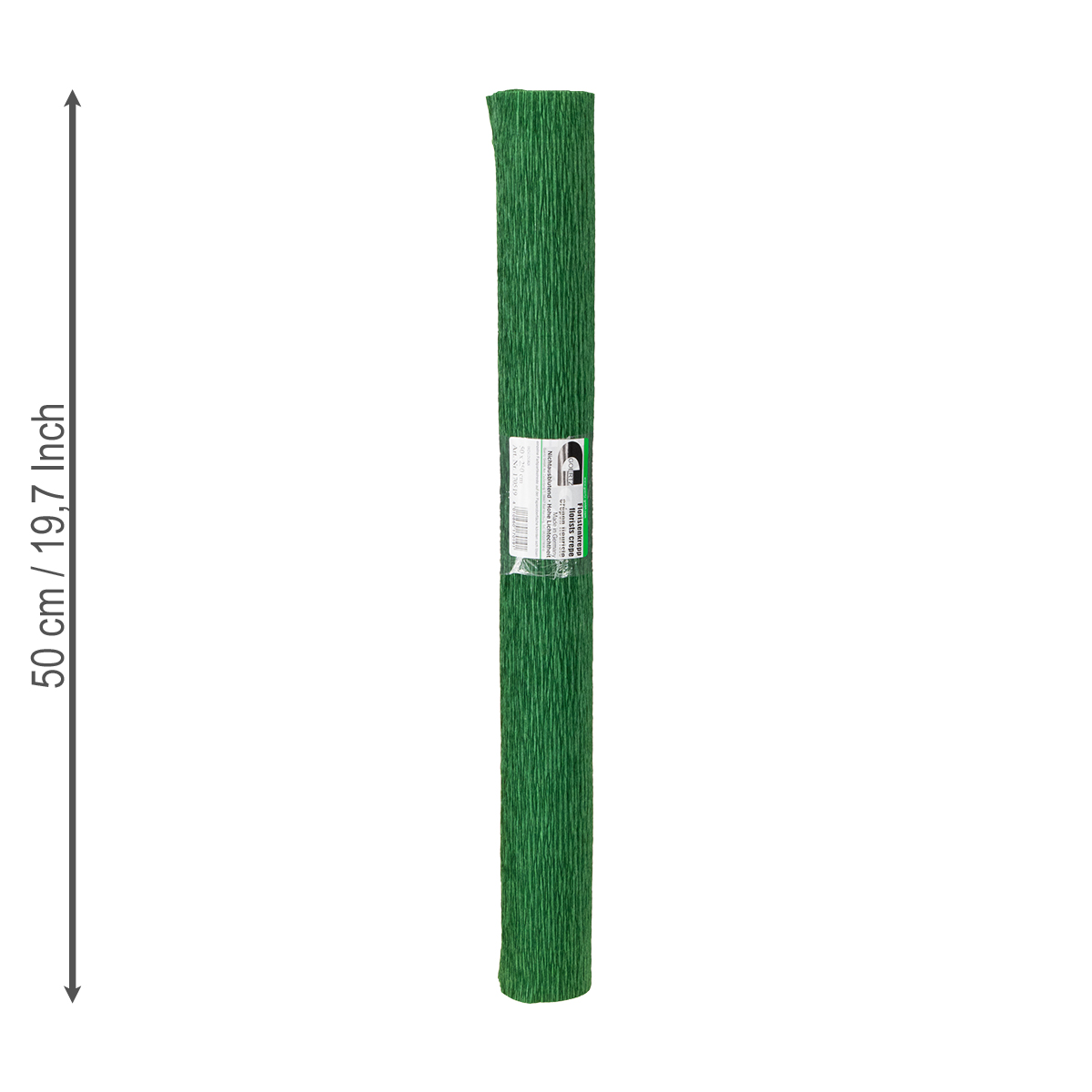 Kvetinársky krepový papier v tmavozelenej farbe má rozmer približne 50 x 250 centimetrov a je dodávaný ako rolka. Gramáž je asi 128 gramov na meter štvorcový a hmotnosť je asi 160 gramov.