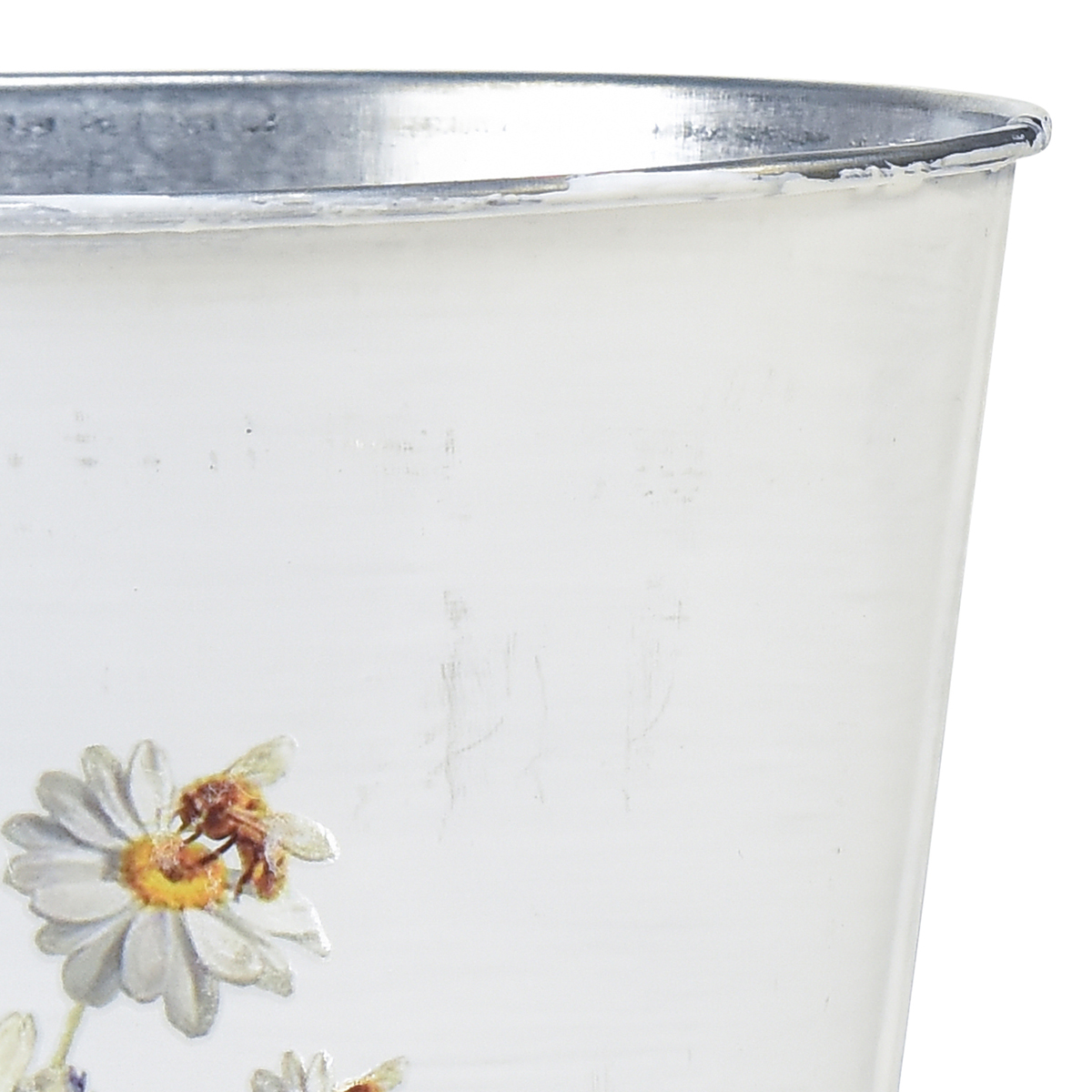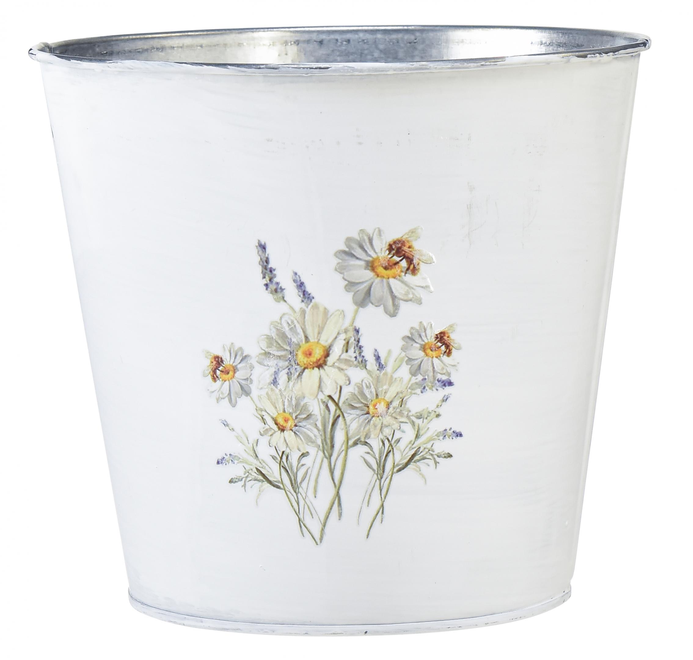 Kovový kvetináč je krásnou dekoráciou na stôl na jar a leto. To, čo ozvláštňuje kvetináč v bielej farbe, je motív kvetov s margarétkami a levanduľou.