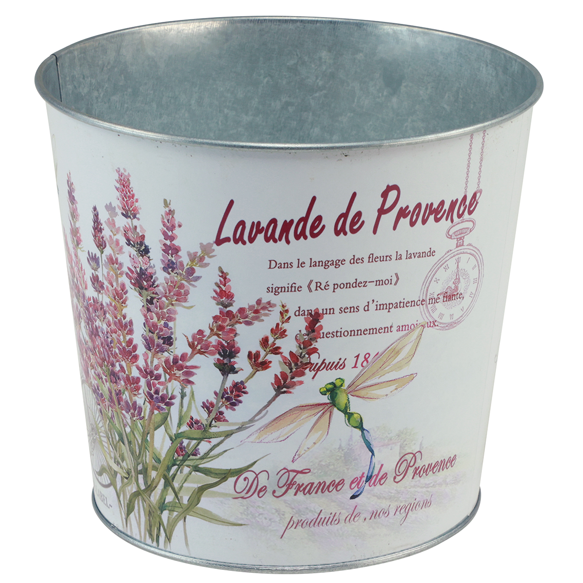 Tento kovový kvetináč prináša rozmanitosť do vašich kvetinových dekorácií so svojím šarmom levandule. Kvetináč je zvnútra pozinkovaný a zvonku zdobený letným motívom levandule a ozdobným francúzskym nápisom.
