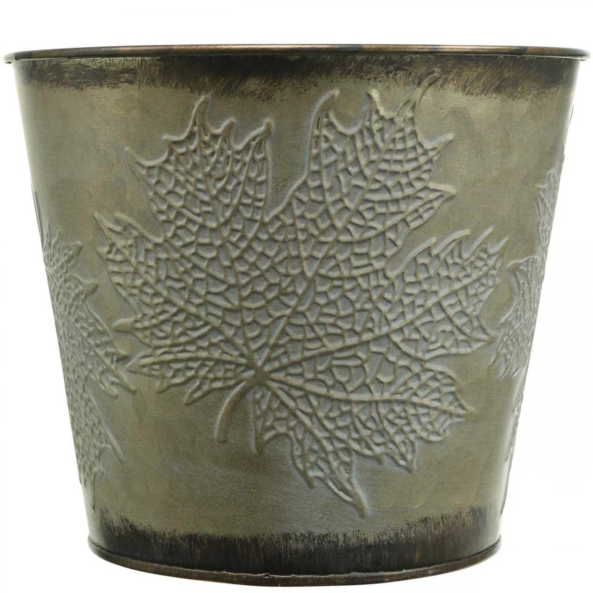 Kvetináč na jeseň, plechové vedierko s ozdobou listov, zlatá kovová nádoba Ø14cm V12,5cm