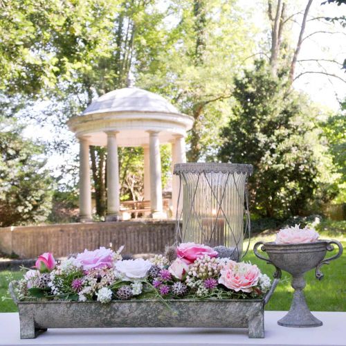 Žľab na výsadbu s ozdobným lemovaným vonkajším okrajom má na spodnej strane dve zahnuté nohy, takže ho možno postaviť kdekoľvek. Na úzkych bokoch kovovej misky je pripevnená kovová rukoväť, pomocou ktorej možno kvetináč kedykoľvek jednoducho presúvať. Plechový žľab má rustikálnu patinu umelej medenky a patiny, ktorá dodáva kovovej dekorácii originálny starožitný vzhľad, akoby pochádzal z dávnych čias.