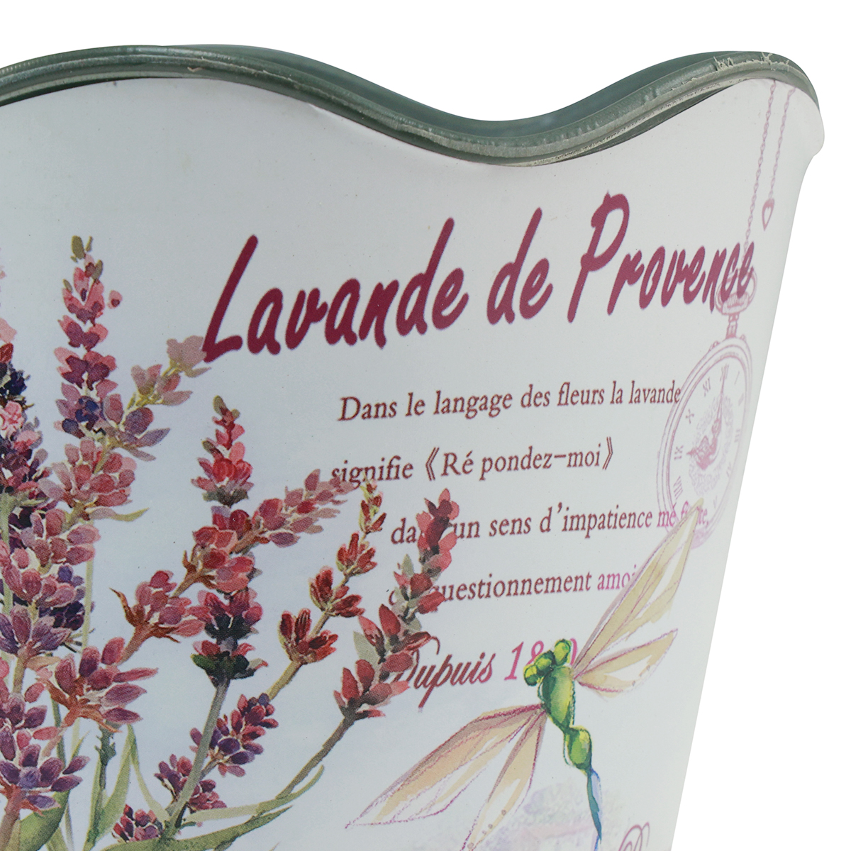 Nádoba je celá vyrobená z odolného plastu. Levanduľový kvetináč je teda vhodný ako kvetináč. S francúzskym nápisom potlače, ktorý odkazuje na levanduľové polia Provence a retro motívmi, z plastového kvetináča dýcha nostalgia. Okraje sú krásne zvlnené.