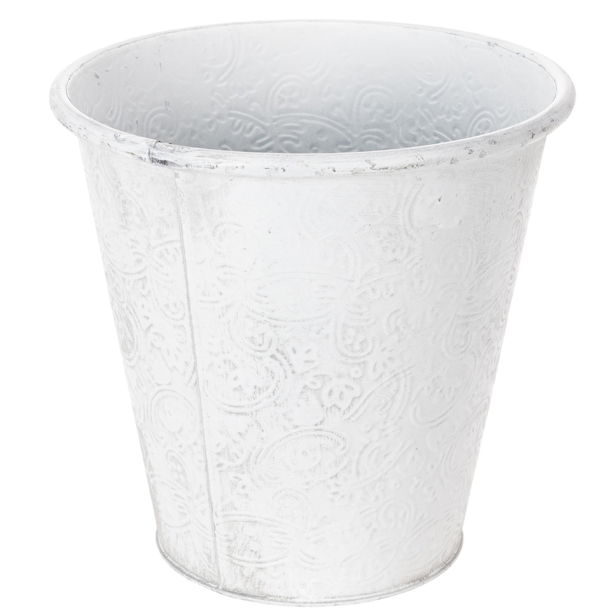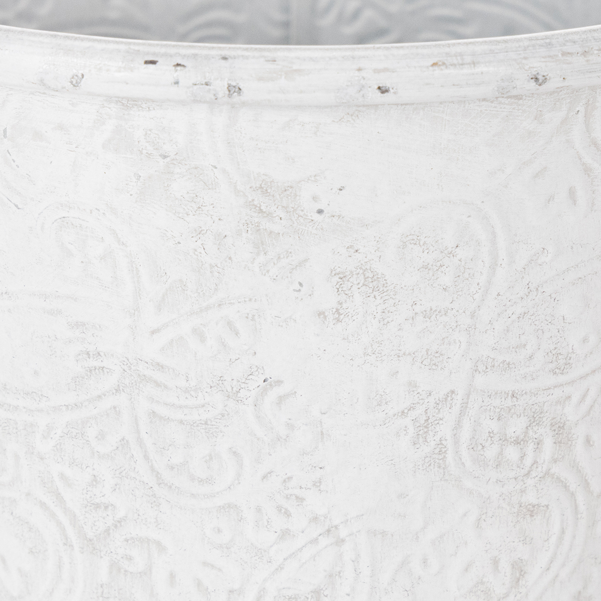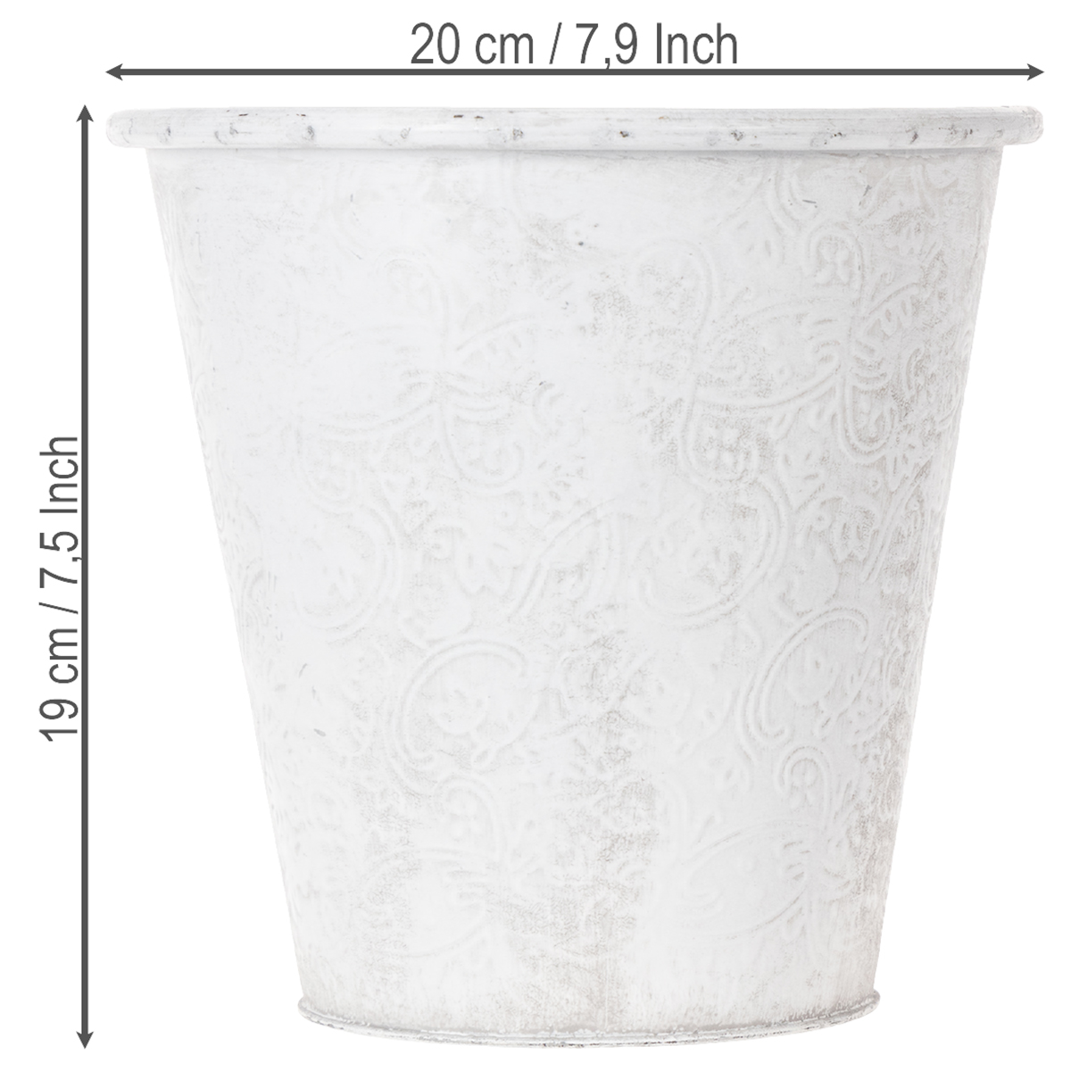 Rozprávkový kvetináč je zdobený ornamentmi: kovová dekorácia je po celom obvode vyrazená kvetmi. Vďaka svojmu romantickému vzhľadu a bielemu umývaniu v trendy shabby chic sa kovová nádoba skvele hodí aj ako dekorácia na stôl vo vintage štýle pre kvetinovú výzdobu na svadbu!