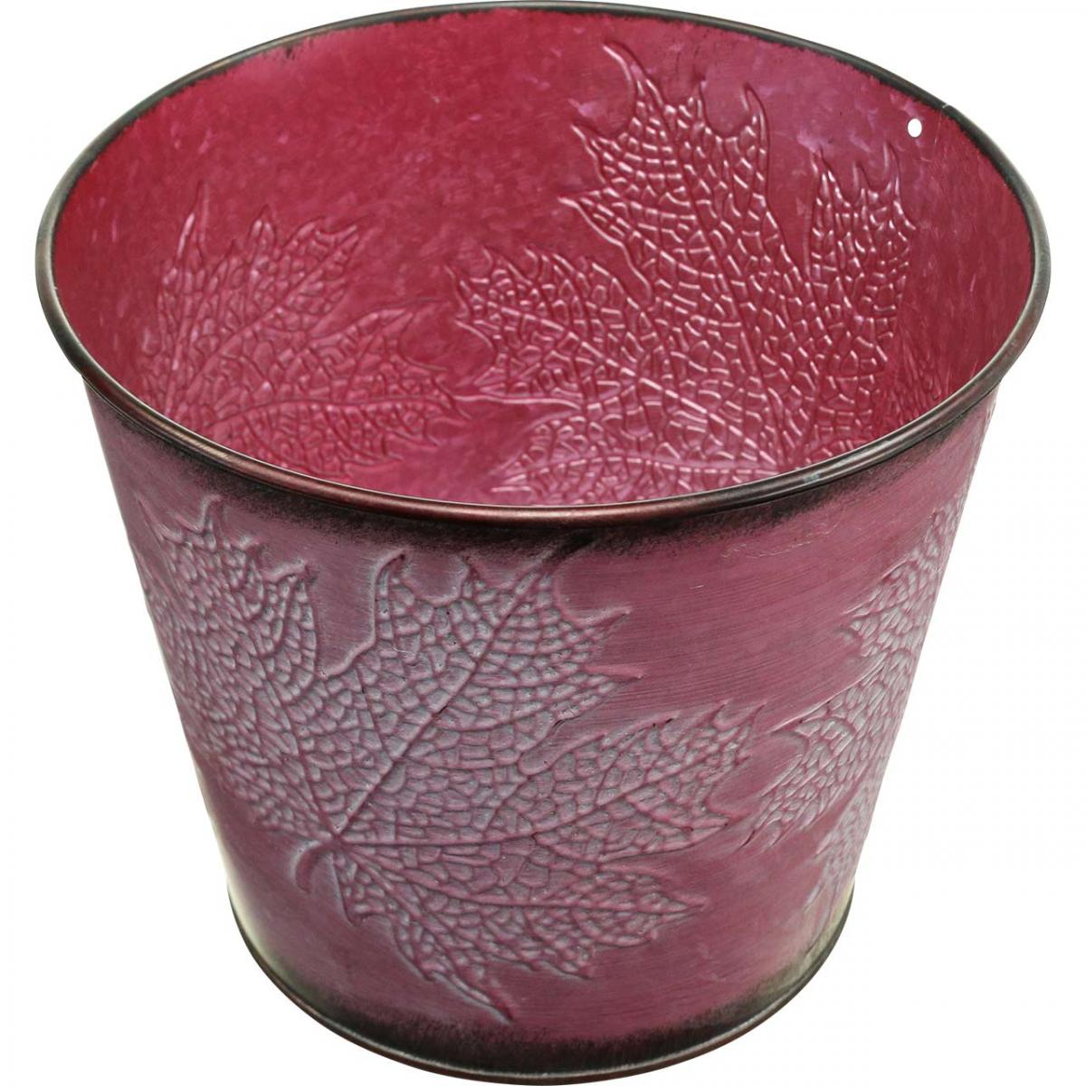 Kvetináč s ozdobou listov, jesenná dekorácia, kovový kvetináč vínovočervený Ø16,5 cm V14,5 cm
