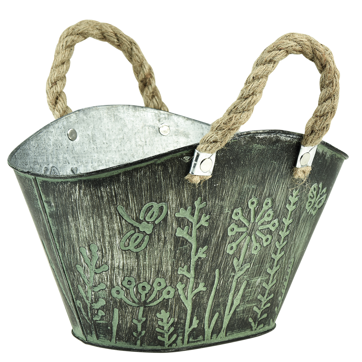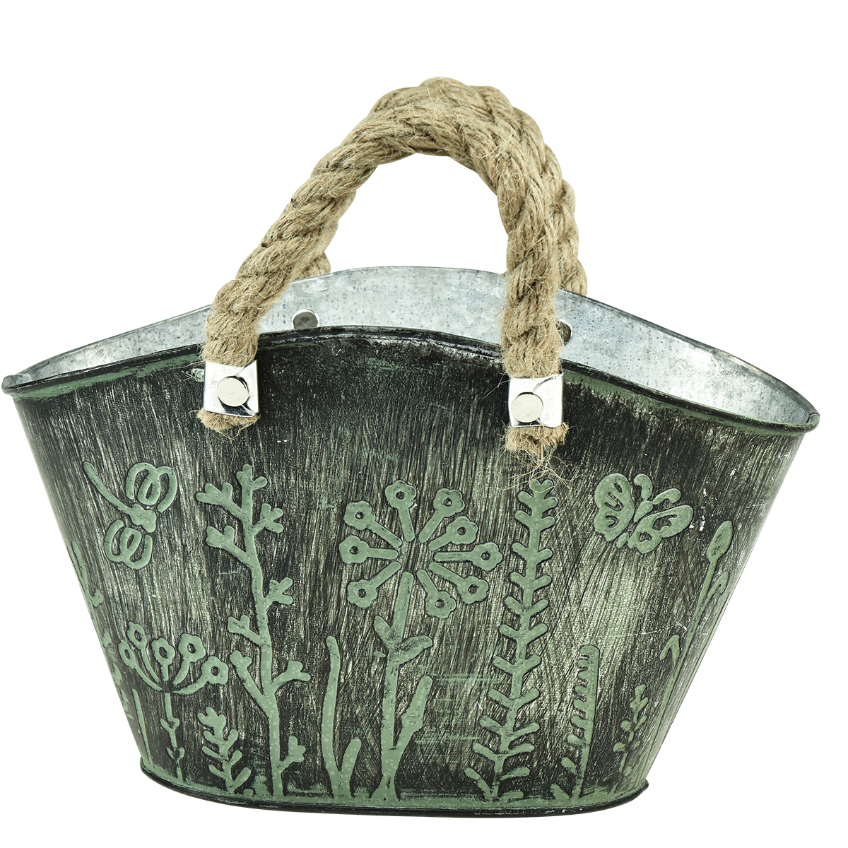 Kvetináč má tvar tkanej nákupnej tašky a pôsobí veľmi uvoľnene. Kovový črepník je zvonku upravený v zelenej a tmavosivej farbe a vzhľad charakterizuje štylizovaná divoká kvetinová lúka. O zvyšok sa postarajú spletené rukoväte z prírodného vlákna, aby sa z oválneho kvetináča stal veľmi zvláštny kúsok.