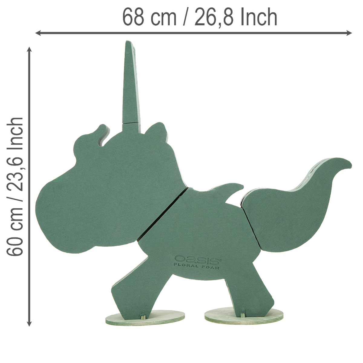 Získajte trendy jednorožca. Vytvorte očarujúco originálnu atmosféru na vašej ďalšej párty alebo akcii! Jednorožec zo série OASIS® BIOLINE® pozostáva prevažne zo zelenej vlhkej kvetinovej peny. Stojí na dvoch stabilných, zelených drevených podnožiach. Veľmi ekologická kvetinová pena je vybavená reznými líniami. Tie minimalizujú vysychanie.