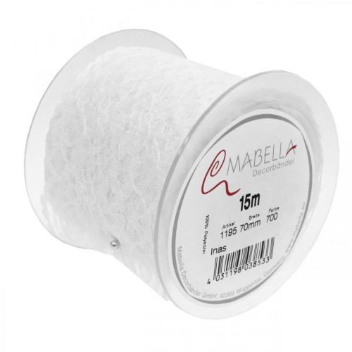 Ozdobná stuha v bielej farbe je vyrobená zo 100% kvalitného polyesteru, je široká cca 70 milimetrov a dlhá cca 15 metrov. Ozdobnú čipku dostanete navinutú na plastovú cievku a prišpendlite ju malým perlovým špendlíkom.