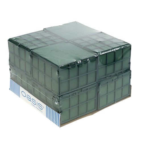 Tento OASIS® Garnette 36 v sade 8 tehlových mriežok s ½ kvetinovej penovej tehly v každej meria približne 11,5 x 11 x 8 centimetrov. Tmavozelené produkty z mokrej kvetinovej peny a plastu svojou farebnosťou ladia s farebnými kvetmi aj v tón v tóne kreáciách s množstvom sviežej zelene.