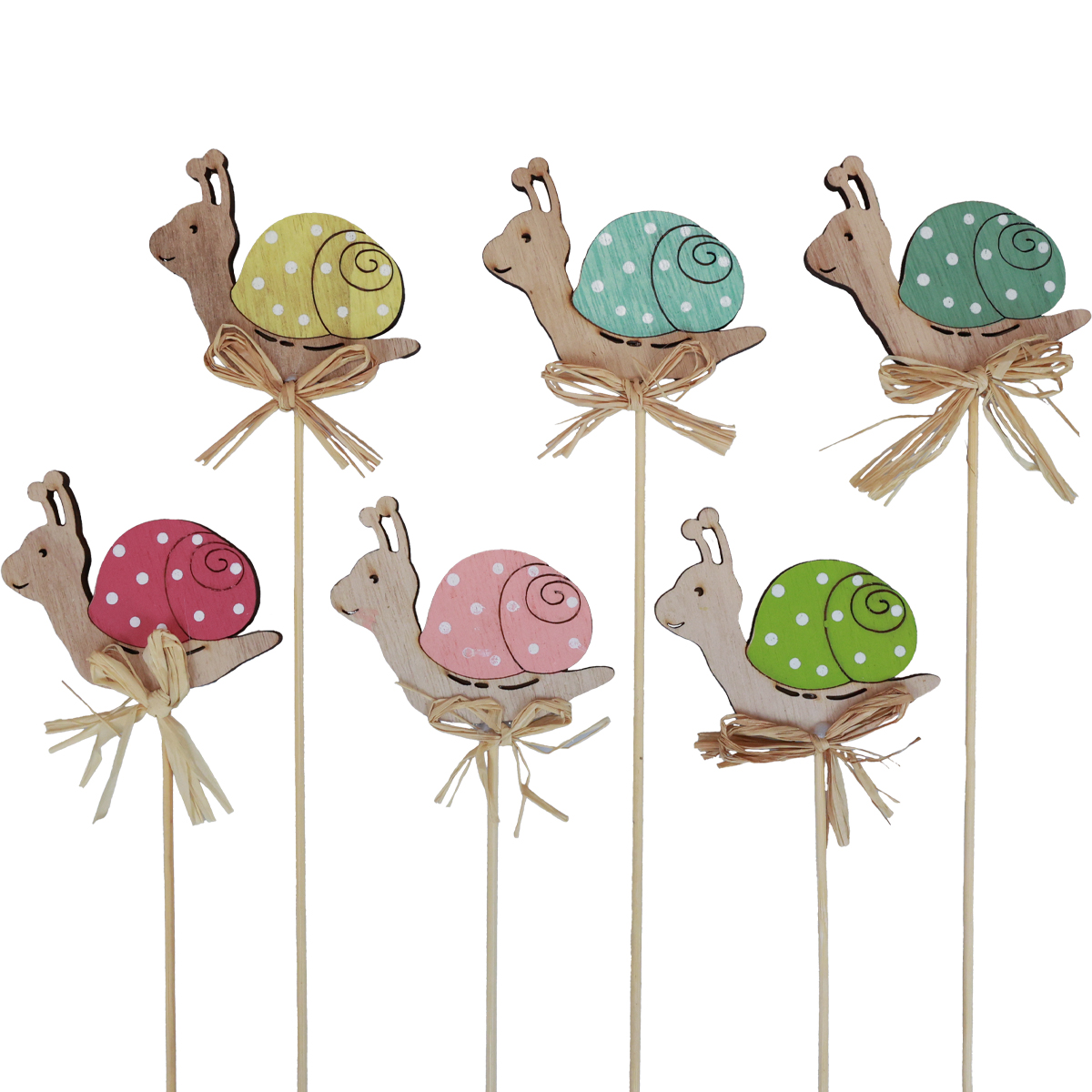 Priateľský úsmev, farebná ulita slimáka s bielymi bodkami a prírodnou kresbou dreva - túto dekoratívnu hmoždinku si zamilujete na prvý pohľad. Vďaka dlhej drevenej tyči sú ozdobné slimáky dokonalým doplnkom kytíc na jar a v lete.