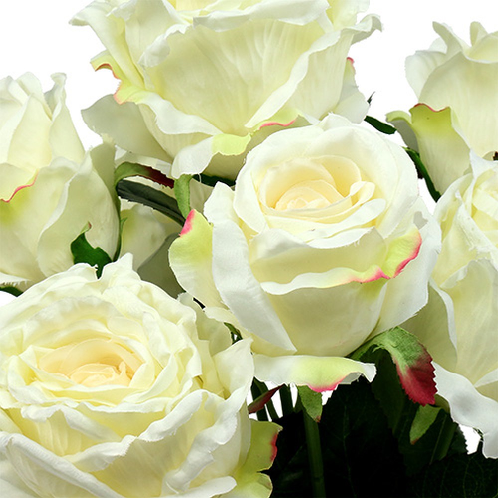 Umelá kytica ruží v bielej a krémovej farbe má 7 láskyplne detailne prepracovaných kvetov a listov vyrobených z látky a stabilné stonky z robustného plastu. Celkovo je kytica dlhá asi 55 centimetrov a priemer jedného kvetu sa pohybuje medzi 7 až 10 centimetrami.